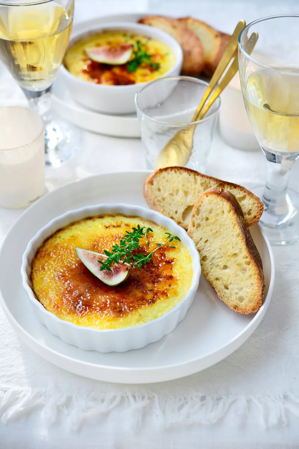 Strooi wat suiker over de crème brûlée en gebruik een bunsenbrander om de suiker te karamelliseren. Werk af met een takje tijm en een partje vijg. Serveer met stokbrood.