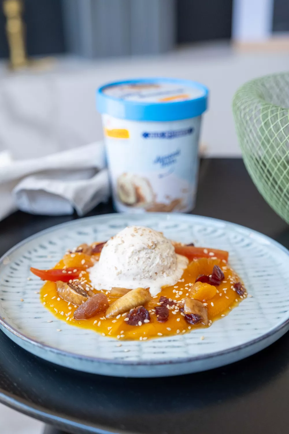 Schep telkens twee lepels van de zoete aardappelcrème op een bord. Schik er enkele stukjes gedroogd fruit bovenop en schep er dan en bolletje Almond Thins ijs op. Werk af met sesamzaadjes.