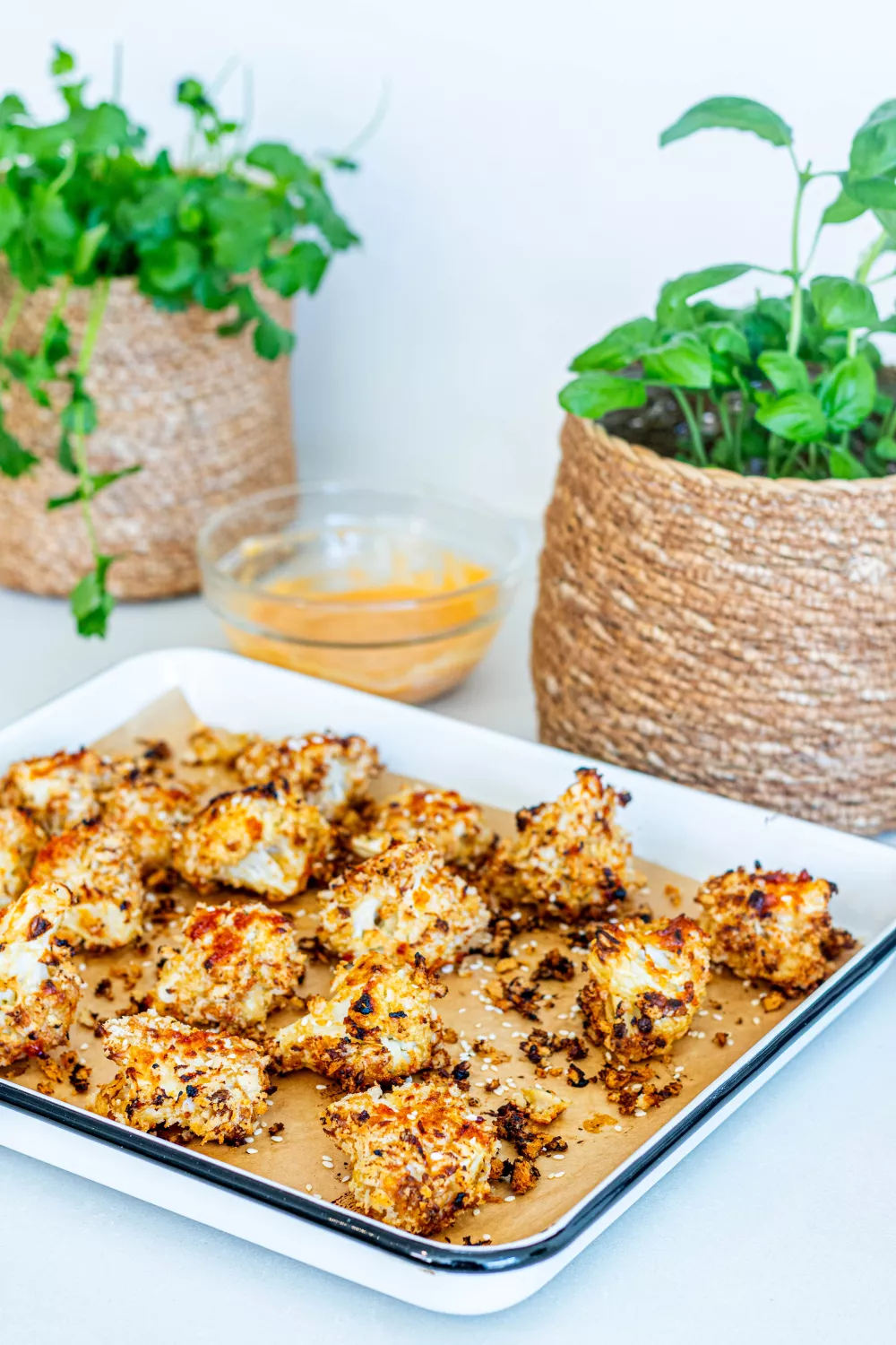 Deze krokante ovengebakken bloemkool met currypasta en pindakaas combineert pittige en romige smaken tot een onweerstaanbare vegetarische snack. De roosjes worden bedekt met een romig beslag en een krokant panko laagje en goudbruin geroosterd in de oven, voor een knapperige bite. Perfect als borrelhapje of bijgerecht, afgewerkt met zoet pittige chilisaus en sesamzaadjes.