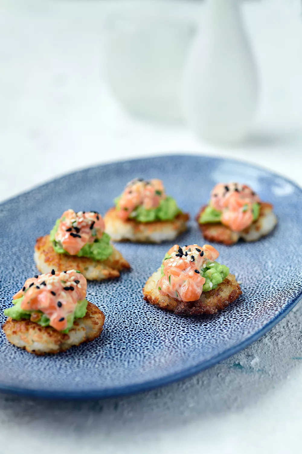 Laat de schijfjes rijst uitlekken op keukenpapier en schik ze vervolgens mooi op een bordje. Lepel er wat avocadopuree en zalm op. Werk nog af met sesamzaadjes.