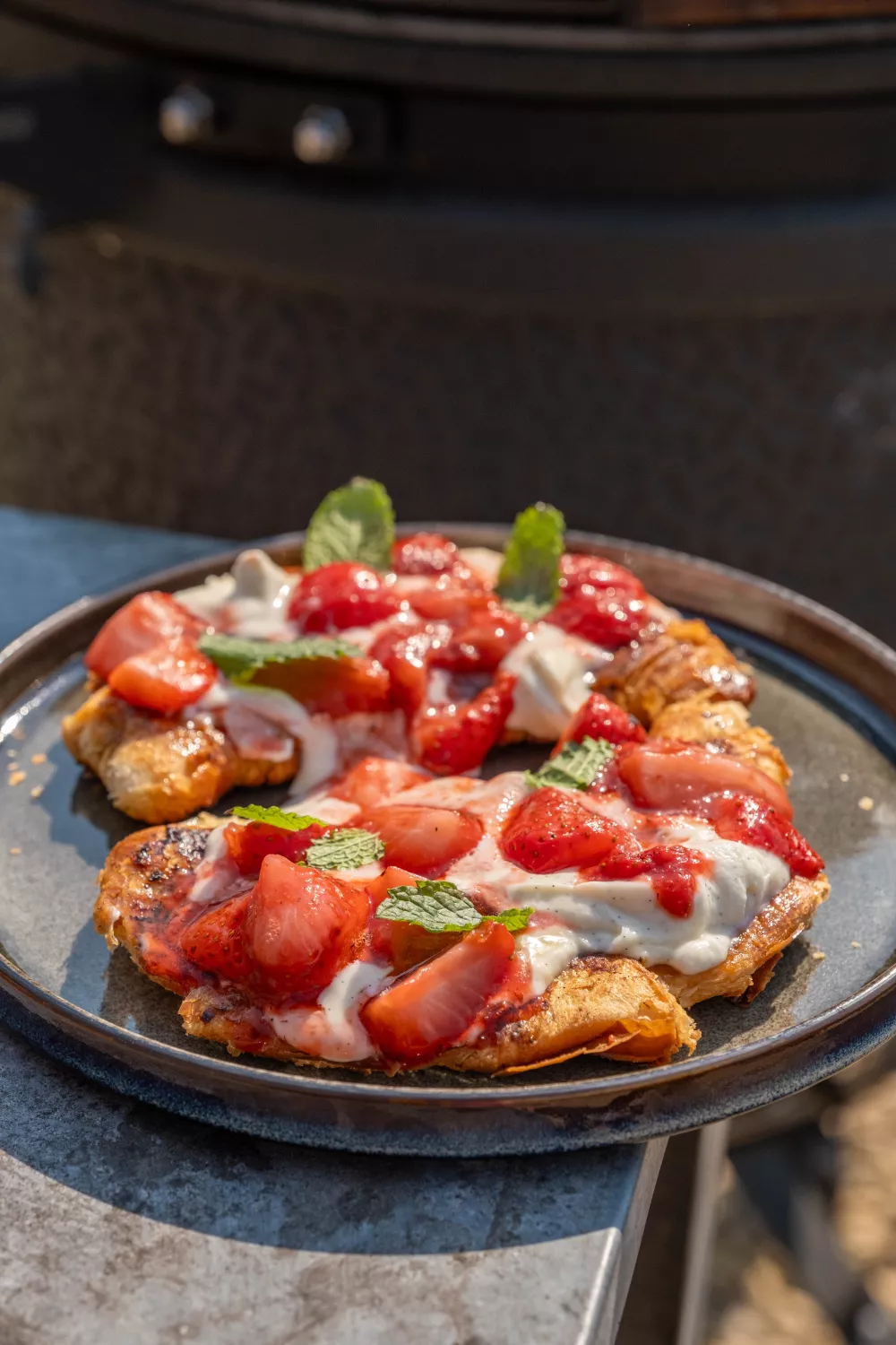 Knapperig geroosterde croissant sandwich gevuld met romige mascarpone en sappige aardbeien, perfect voor een zomerse brunch of picknick. De aardbeien worden zachtjes gegaard met rozemarijn op de grill van de Bastard voor een subtiele kruidigheid, terwijl de croissants licht worden geplet met een gietijzeren pan en besprenkeld met honing. Een paar blaadjes verse munt maken dit zoet-kruidige hapje fris en verfijnd.