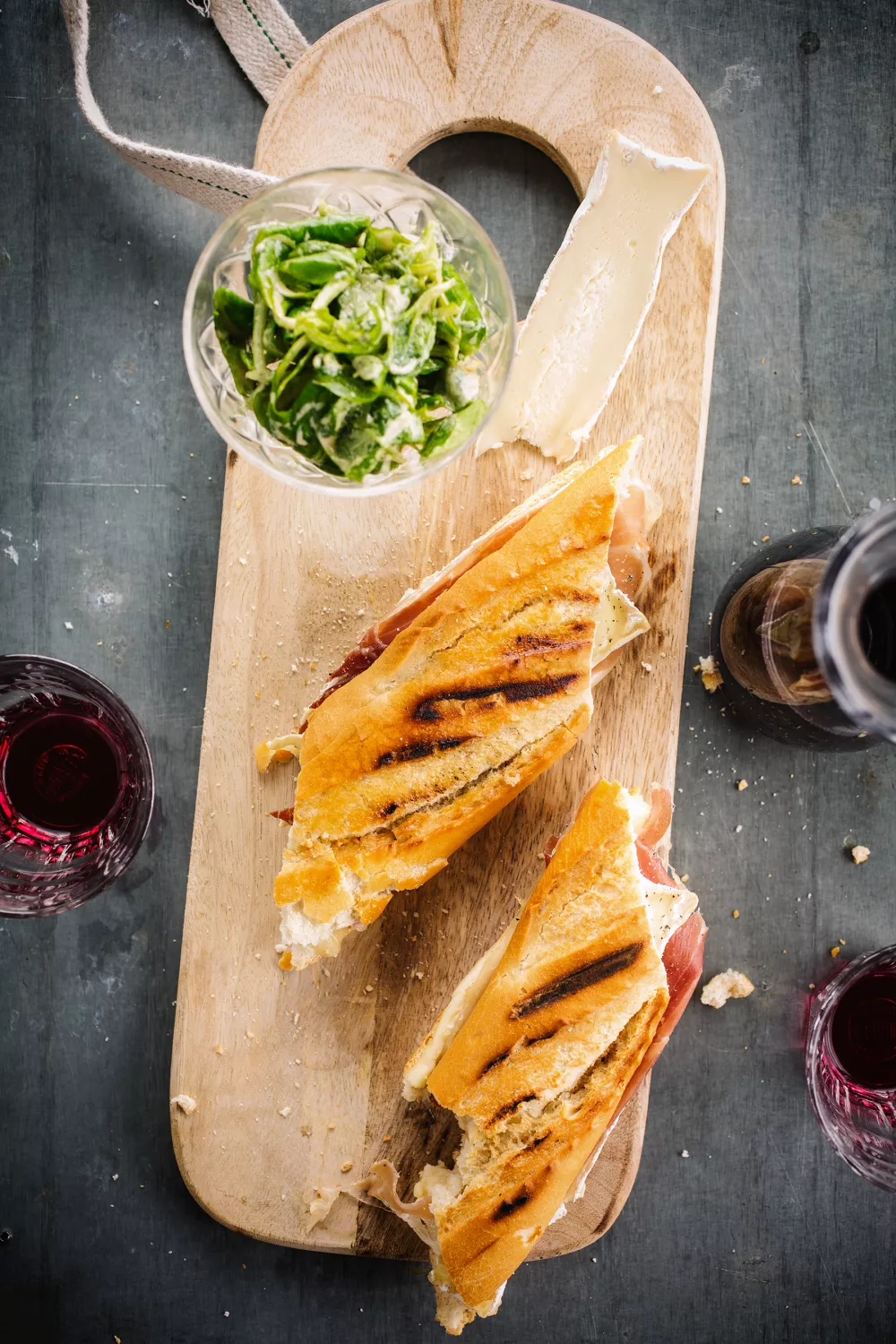 Deze croque baguette legt romige brie en zoute Bayonneham tussen boterig stokbrood dat goudbruin gegrild wordt in het paniniapparaat en kort in de oven tot alles heerlijk smelt. De mosterdvinaigrette met sjalot en een frisse kropsla of eikenbladsla zorgt voor pittig en knapperig contrast. Ideaal als snelle lunch, troostrijk avondmaal of gezellige borrelhap met een Franse toets.
