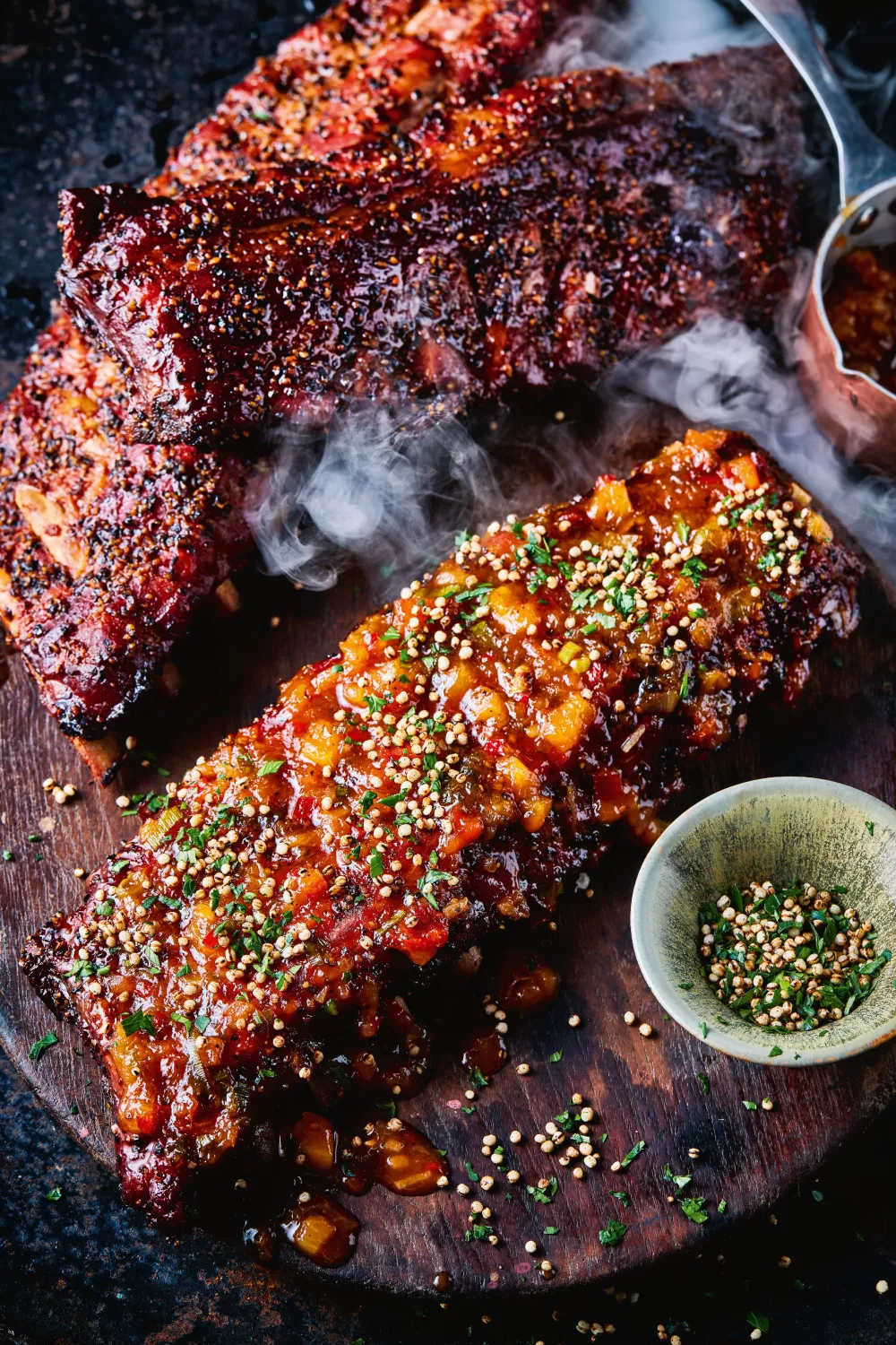 Malse spareribs met rokerig bourbon en perzikglazuur, gekruid met sriracha, zeezout en grof gemalen zwarte peper. Langzaam en indirect op de BBQ of in de smoker gegaard krijgen ze een diepe rooksmaak, waarna boter en de glanzende saus ze perfect afwerken. Een krokante topping van kort gefrituurde gepofte quinoa met peterselie en zout zorgt voor verrassende crunch, ideaal voor zomerse barbecues en feestjes.