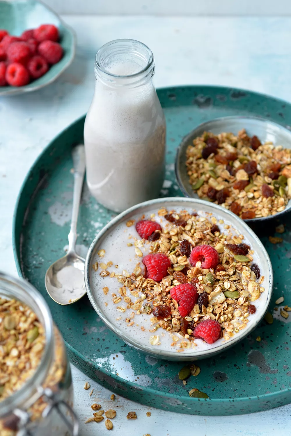 Deze crunchy granola met romige bananenmelk combineert krokante havervlokken en boekweit met cashewnoten, pompoenpitten en kokosschilfers, op smaak gebracht met kaneel en nootmuskaat. Door de granola kort te bakken met ahornsiroop en kokosolie ontstaat een geurige, knapperige mix die ideaal is voor ontbijt, brunch of een voedzame snack in elk seizoen. Serveer met zelfgemaakte bananenmelk uit de blender voor een zachte vanille en banaansmaak die de kruimelige textuur mooi tegenwicht biedt.