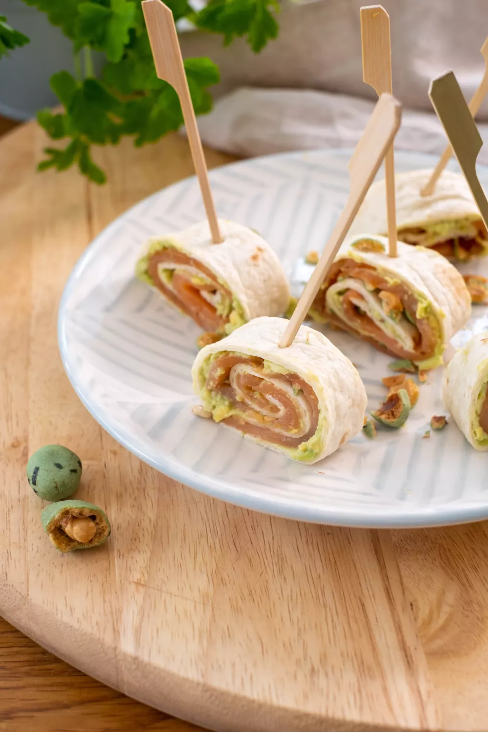 Crunchy wraprolletjes met zalm, avocado en wasabinootjes