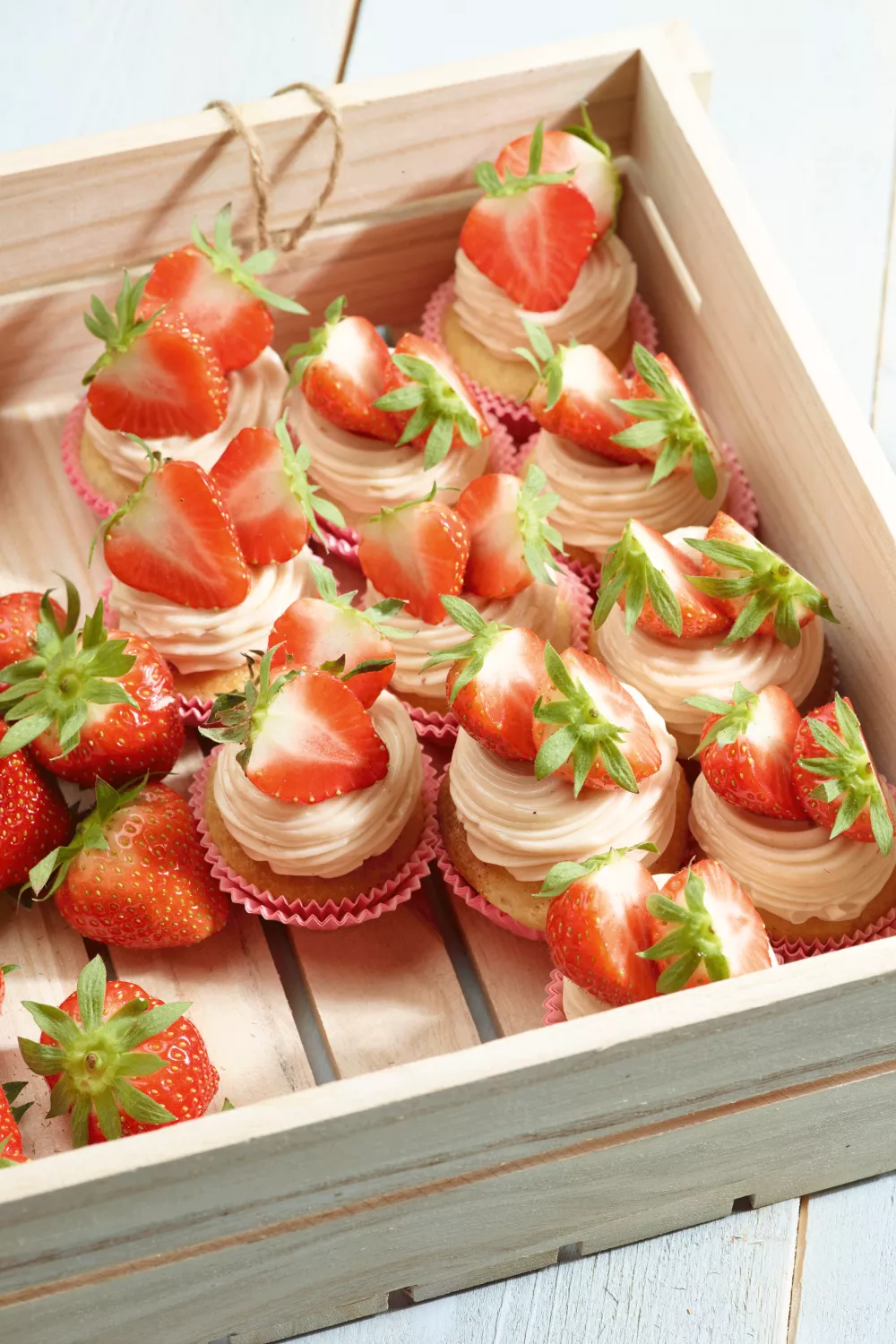 Deze luchtige cupcakes met verse aardbeien en romige mascarponecrème zijn een feestelijk en zomers gebakje. Het eenvoudige beslag van bloem, melk, ei, kristalsuiker, bakpoeder en zonnebloemolie wordt snel gemengd en gebakken tot goudbruin. De botercrème met mascarpone en aardbeienconfituur klop je luchtig, spuit je op de cakejes en werk je af met halve aardbeien voor een huisgemaakt dessert dat perfect is voor lentebrunch, picknick of feestje.