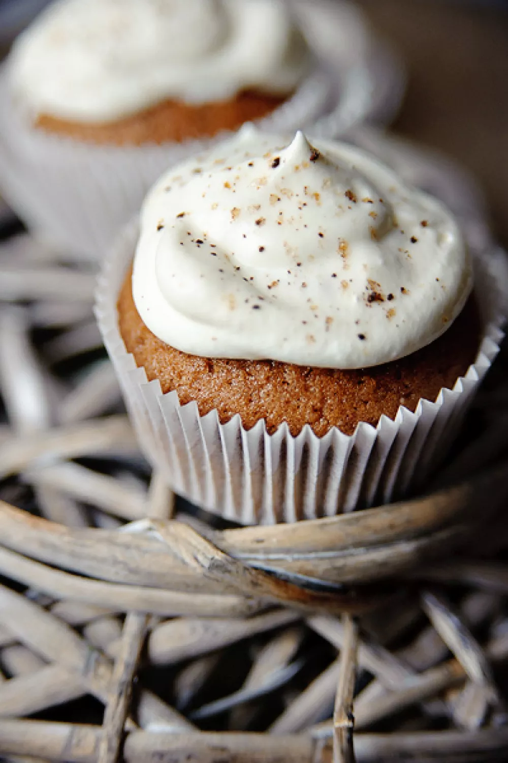 Top de cupcakes met de slagroom en garneer met een vleugje espresso of cacaopoeder.