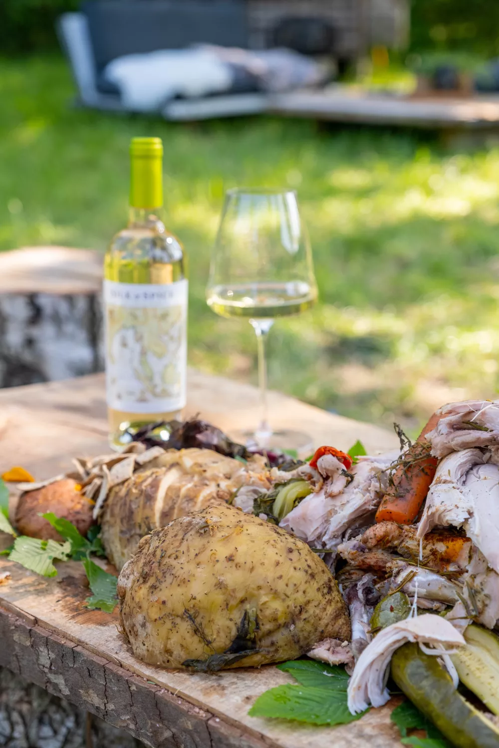 Haal het voedselpakket uit de grond en knoop het laken open. Serveer de kalkoen samen met de gegaarde groenten.