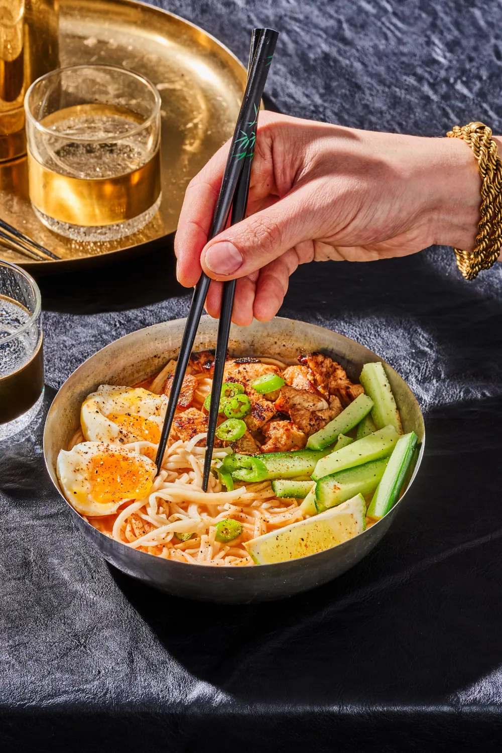 Gaar de ramennoodles in kokend water en spoel ze daarna koud af.