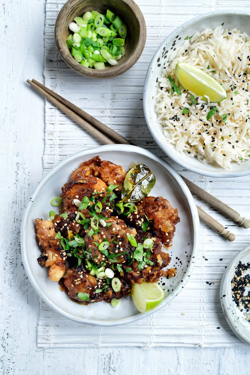 Meng de kip onder de saus en verdeel over kommetjes. Werk af met sesamzaadjes, lente-ui en koriander. Serveer optioneel met rijst.