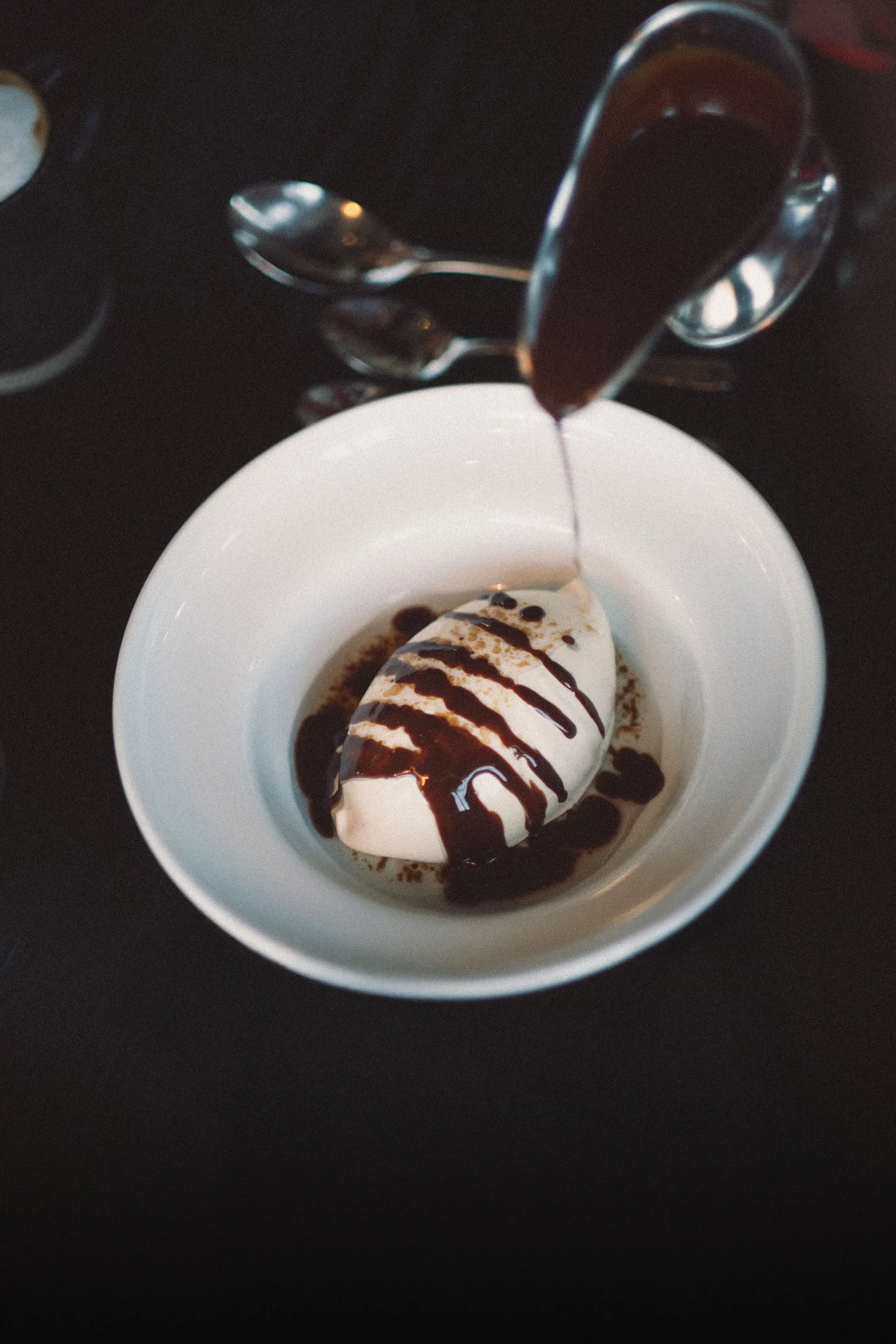Dit verfijnde dessert met huisgemaakt vanille-ijs, chocoladesaus, koffieroom en vanillevinaigrette is een ware ode aan pure smaken en contrasten. Fluweelzacht vanille-ijs op basis van room en schapenmelk wordt gecombineerd met een intense chocoladesaus, subtiele koffieroom en een verrassende vinaigrette van vanilleolie en oude balsamico. Een elegant, gastronomisch dessert dat perfect past bij een feestelijk diner of een fine dining-moment thuis.