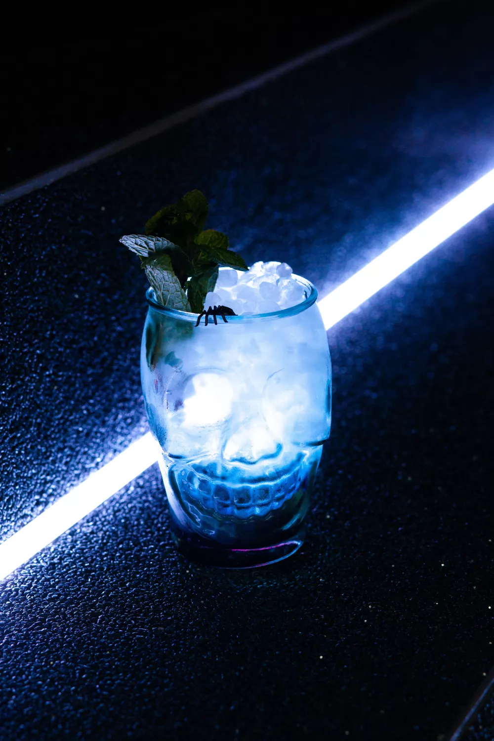 Deze opvallende alcoholvrije mocktail combineert frisse limoen en munt met bruisende 7UP en een vleugje citroenlimonade voor een zomerse en feestelijke smaak. De zwarte eetbare kleurstof en een skelet mojitoglas geven het drankje een speelse, spooky uitstraling, perfect voor Halloween of themafeestjes. De bereiding is eenvoudig: suiker en limoensap mengen, munt kort slaan om de aroma's vrij te laten en vullen met crushed ice en 7UP.