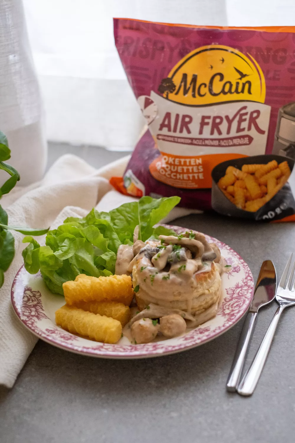 Serveer de vol-au-vent in de bladerdeegkoekjes samen met de kroketjes en sla als garnituur.