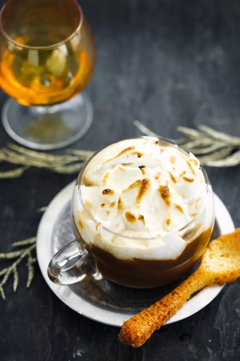 Een feestelijke dessertkoffie met intense espresso, chocoladelikeur en flambé Grand Marnier, afgetopt met goudbruin gebrand eiwitschuim en een krokant kokoskoekje. Het dun uitgerolde koekje van bloem, suiker, boter en gemalen kokos krijgt in de oven een delicate bite terwijl de warme koffie met likeur en vlam zorgt voor een theatrale, aromatische touch. Perfect als verfijnd nagerecht of winterse traktatie bij speciale gelegenheden.