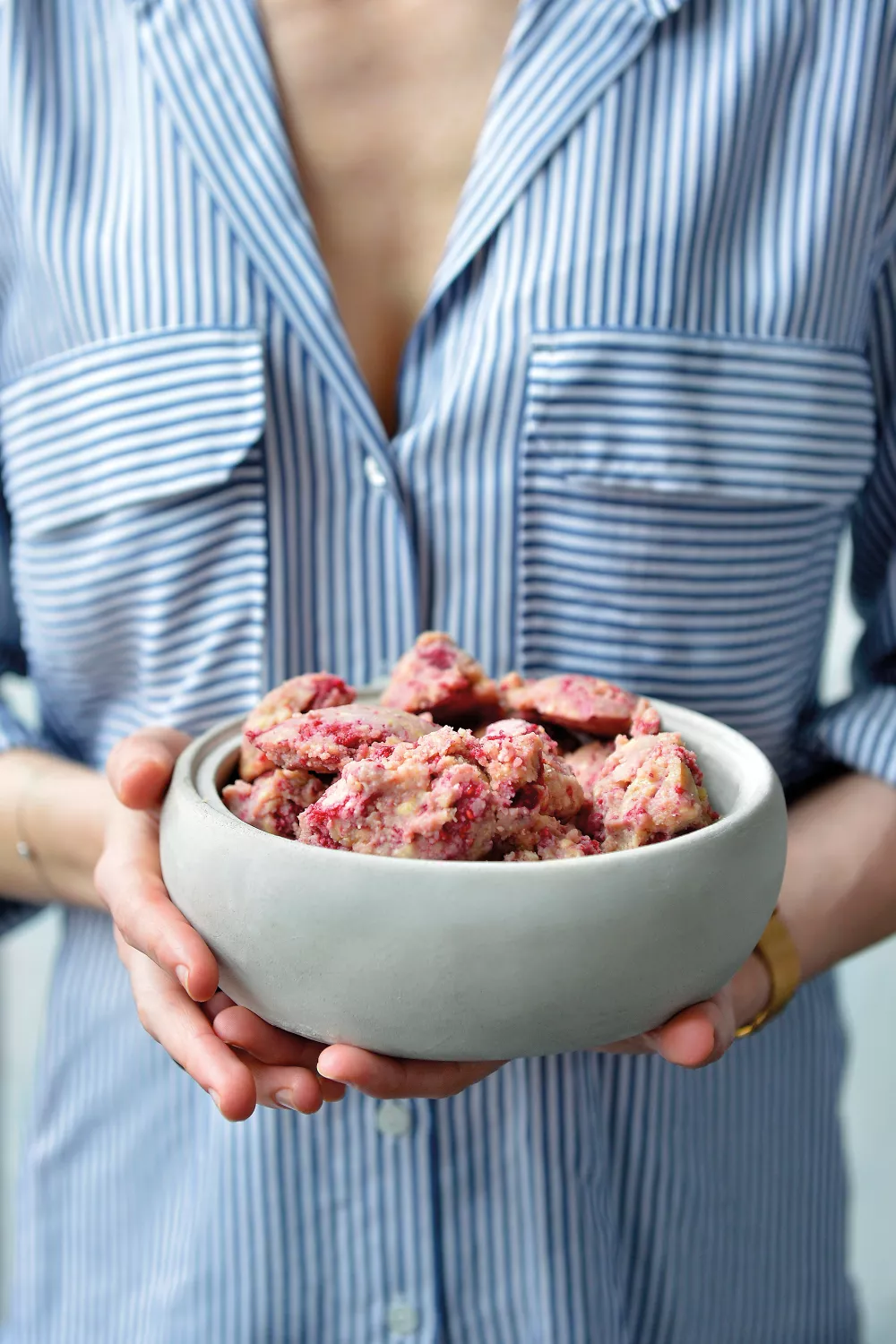 Heerlijke diepvrieskoekjes met frambozen en cashewnoten, fruitig en romig door ahornsiroop en zachte cacaoboter. In een paar simpele stappen blend je de noten, smelt je de cacaoboter en meng je alles tot ovenloze vegan koekjes die ideaal zijn als zomers dessert of gezond tussendoortje. Laat ze even opstijven in de diepvries en serveer koud bij koffie of als feestelijke traktatie.