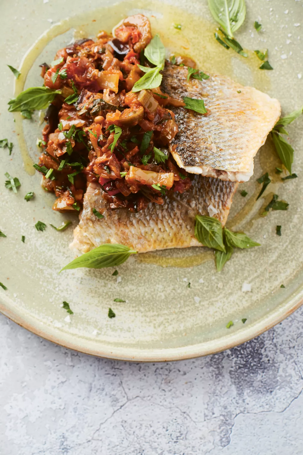 Dresseer de gewenste hoeveelheid warme caponata centraal op het bord. Schik de vis op de caponata. Werk de vis af met een snufje fleur de sel, wat zeste van limoen (gebruik hiervoor een microrasp), een scheutje olijfolie en enkele blaadjes basilicum.