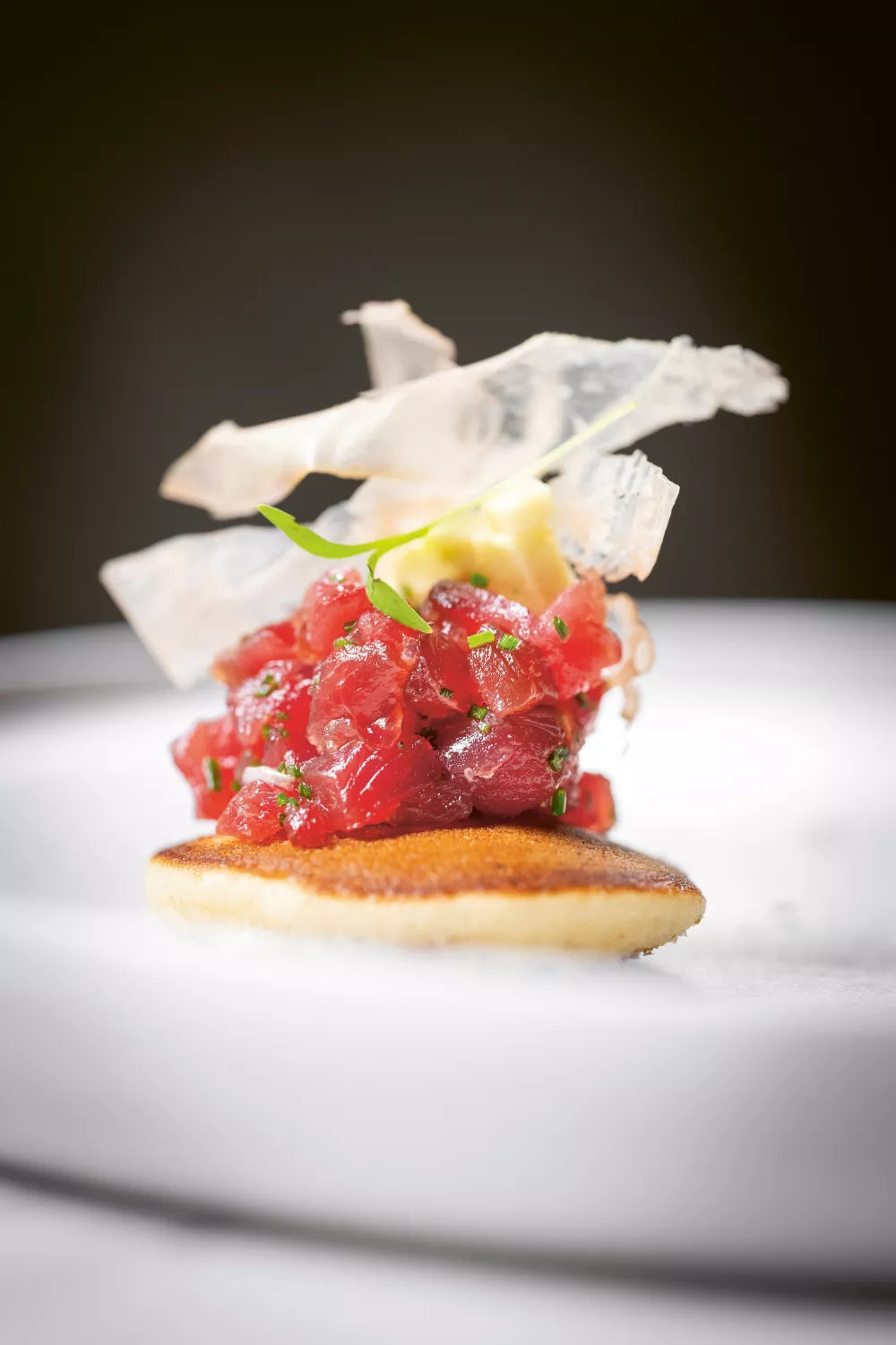 Luchtige dorayaki pannenkoekjes gevuld met frisse tonijntartaar en romige avocado, afgewerkt met katsuobushi en koriandercress voor een intense umami en frisse toets. Het beslag krijgt zijn zachte textuur door eidooiers, sake en bicarbonaat en rust even zodat de mini pannenkoekjes mooi goudbruin bakken. Perfect als verfijnde borrelhap of lichte lunch in lente en zomer, met gember, limoenzeste en bieslook voor een Aziatisch getinte smaakexplosie.
