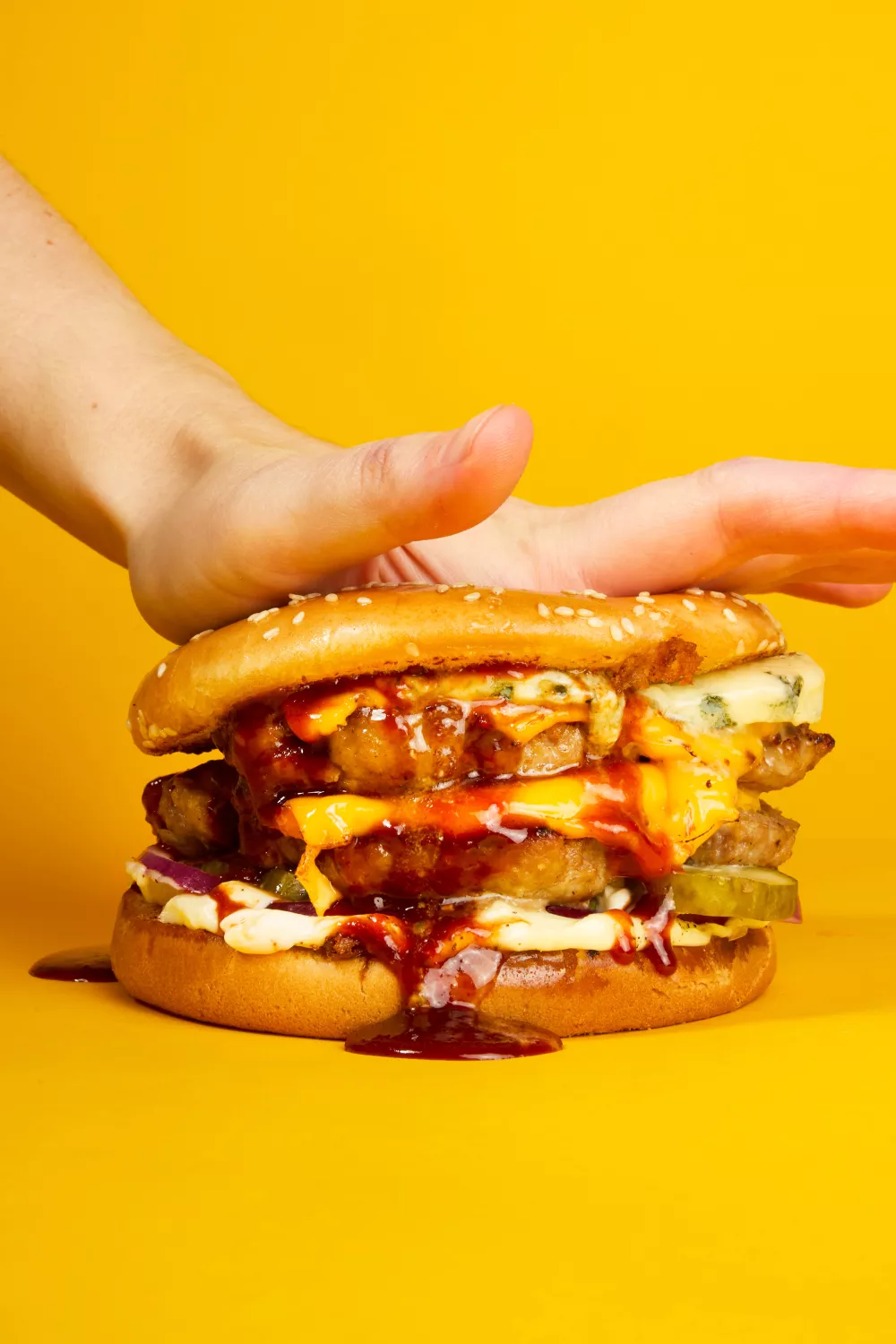 Zodra de burgers klaar zijn en de cheddar gesmolten is, leg je deze boven op de ui en augurk. Twee stukken vlees per broodje dus. Maak af met enkele plakken blauwe kaas en hot sauce.