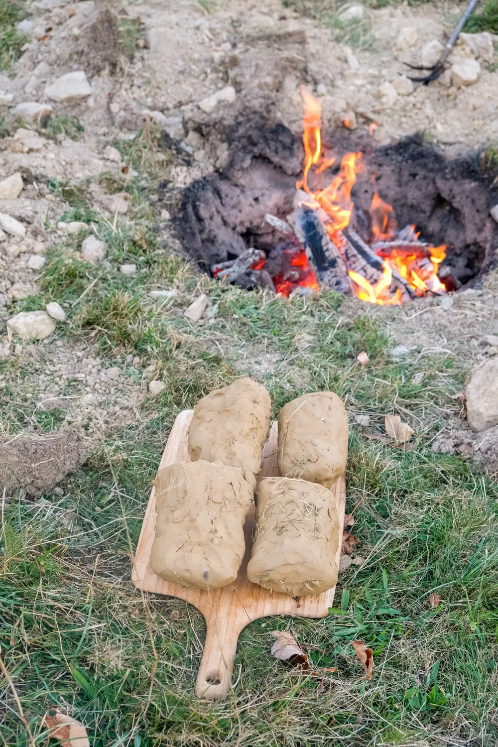 Graaf een put van minimum 1 meter diep. Leg er dikke stenen en takken in. Maak vervolgens het vuur aan het laat het een uurtje branden tot de takken verkoold zijn. Leg nu een rooster bovenop de kolen. Leg de duifjes in klei er op en plaats er een grote gietijzeren pan omgekeerd over. Bedek met extra takken en schup de put dicht. Laat +- 3 u garen.