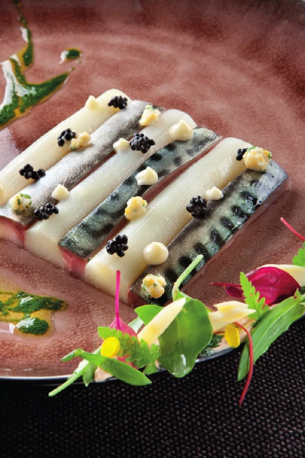 Meng de mayonaise met de sesamolie en geraspte limoenschillen en lepel ze in een spuitflesje. Leg wat mousse van makreel op het bord en schik de gehalveerde, gemarineerde asperges, samen met de in vier gesneden filets van gemarineerde makreel op de mousse. Werk af met puntjes mousse van gerookte makreel, beleg ze met de groene kruiden, het eimengsel en puntjes van de mayonaise. Serveer er de coulis van peterselie bij. Werk af met haringeitjes.