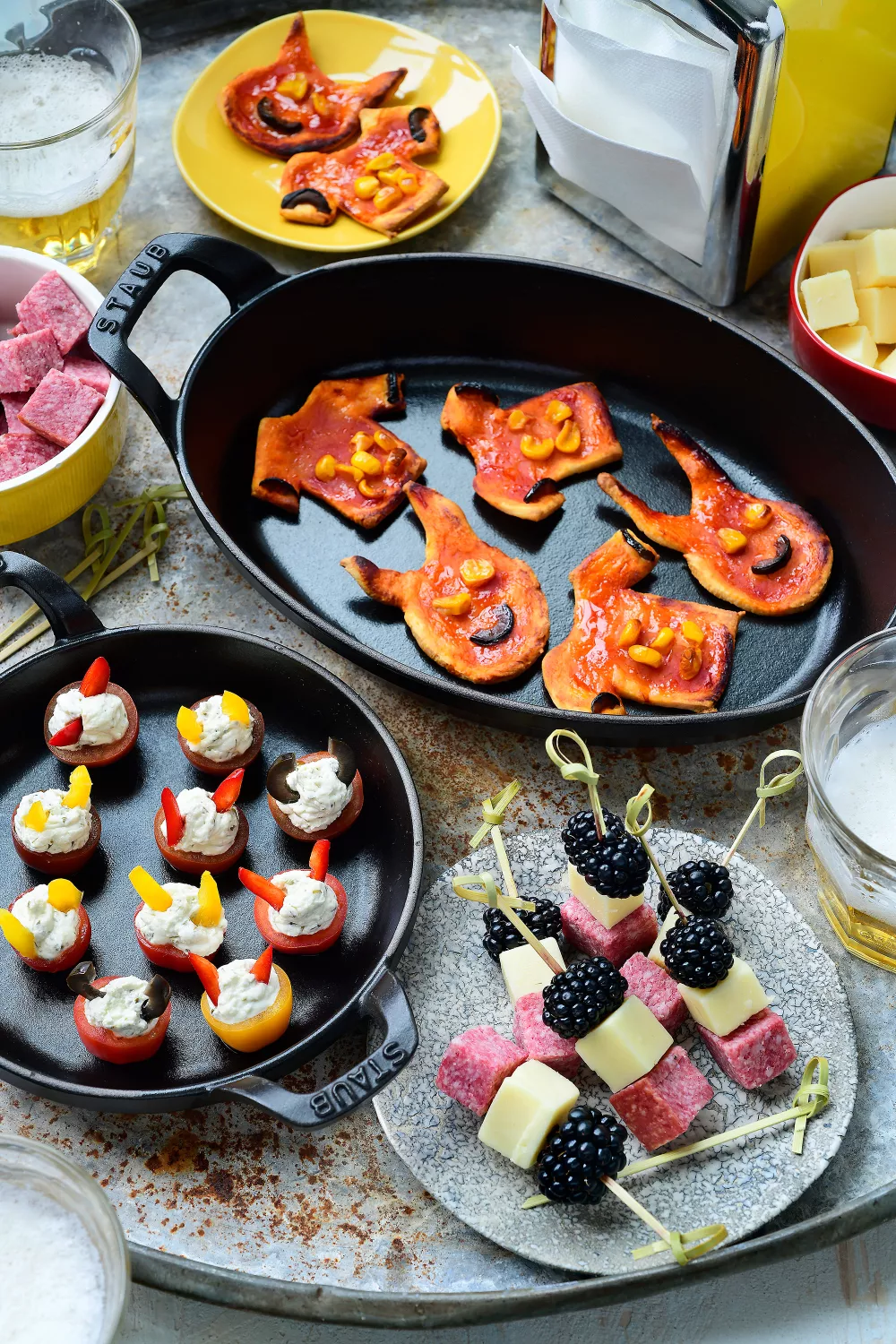 Deze duivelse hapjesplank brengt pittig gevulde kerstomaatjes met cayenne samen met speelse vormpjes uit pizzadeeg en vrolijke satéprikkers met kaas, salami en braambessen. Ideaal voor borrels, feestjes of de kersttafel, met eenvoudige technieken zoals vullen, bakken en prikken. De mix van roomkaas, olijven, paprika en tomatensaus zorgt voor een kleurrijke en smaakvolle fingerfood selectie.