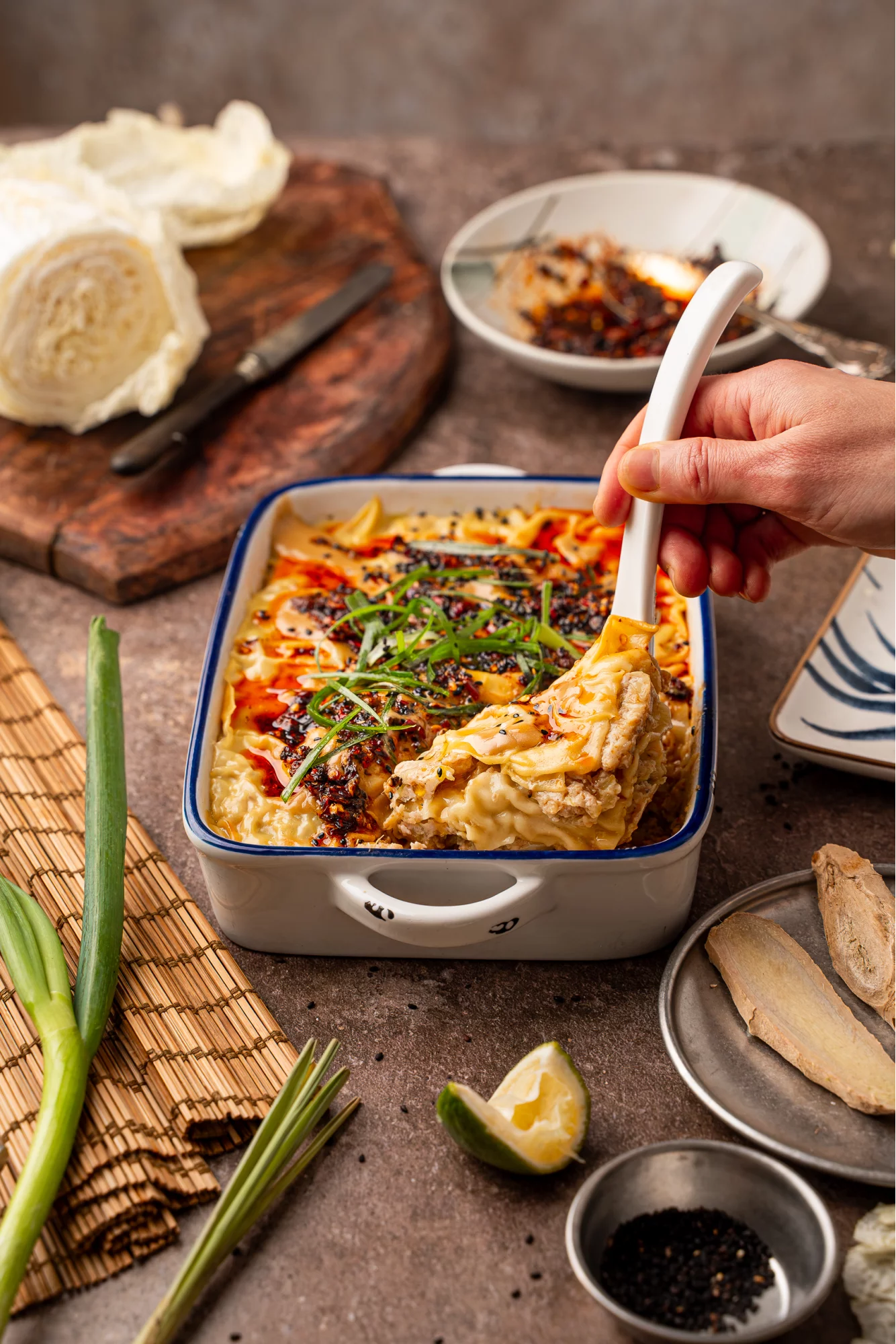 Deze dumpling lasagne met kip, kool en crispy chili-olie is een heerlijke fusion van Aziatische dumplings en een klassieke ovenschotel. In plaats van pastabladen gebruik je zachte wontonvellen, gelaagd met sappig kipgehakt, witte kool, gember en citroengras. De romige tahinisaus en pittige crispy chili-olie maken dit een verrassend en smaakvol comfortgerecht dat perfect is voor doordeweeks of etentjes.