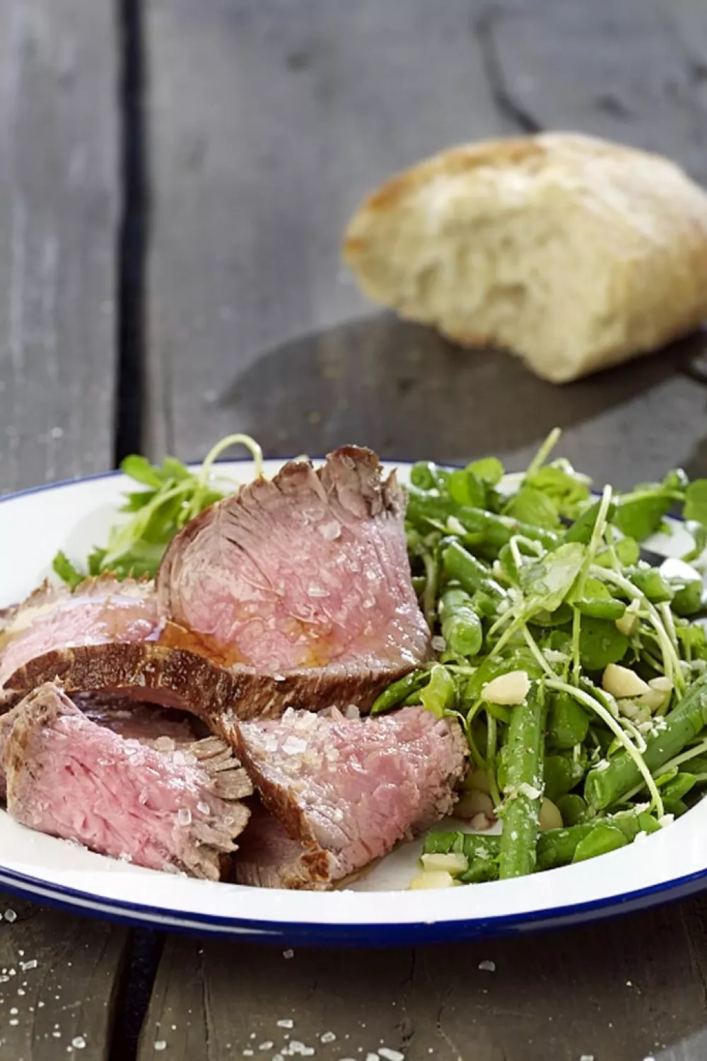 Snij het been van het vlees en snij daarna in schuine sneetjes. Verdeel over de borden en besprenkel met wat olijfolie en zeezout. Dien op met het snijbonenslaatje en een stukje brood of een aardappel in de schil.