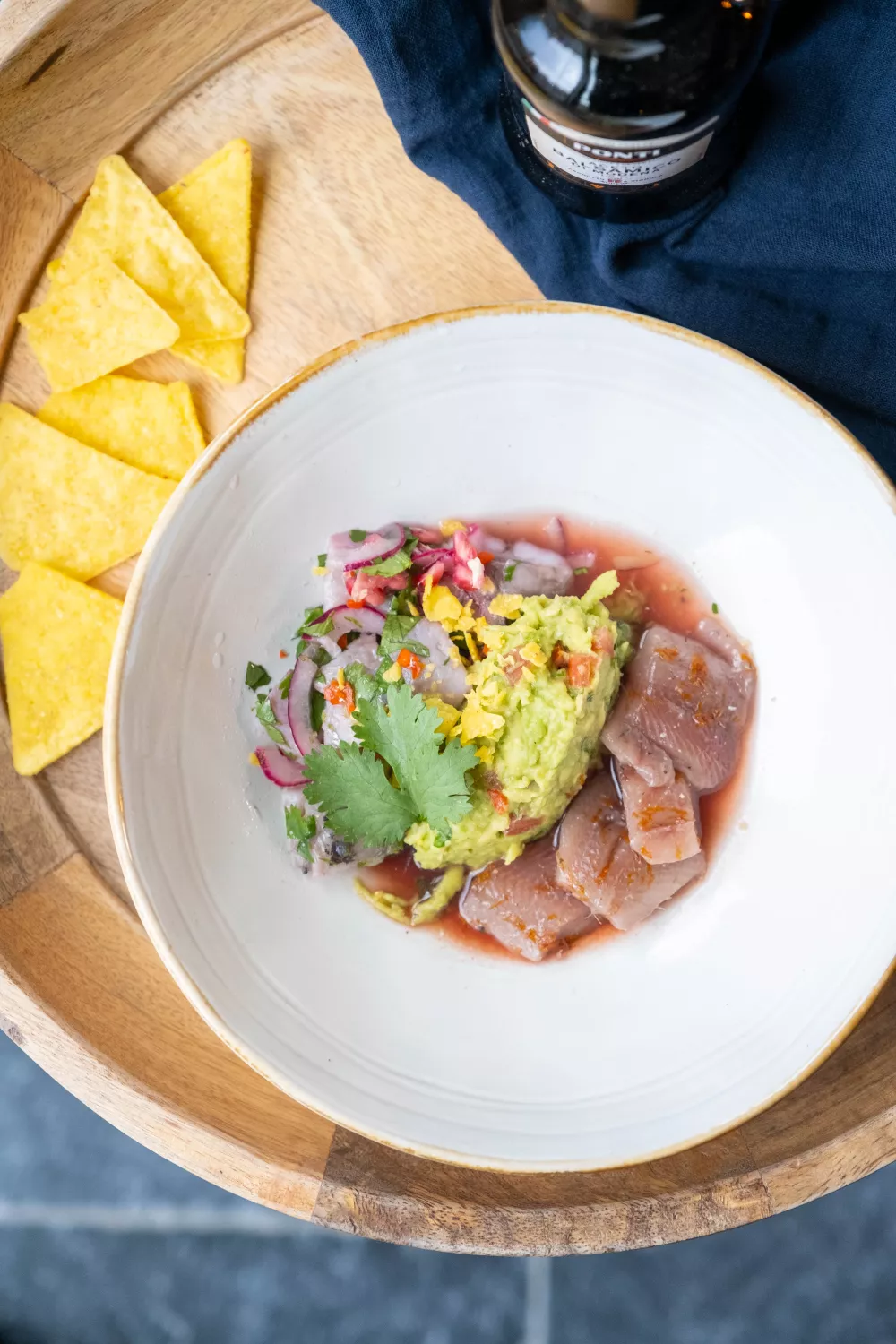 Schep en lepel van de guacamole in een bordje. Schik er de twee soorten ceviche van maatjesharing rond.