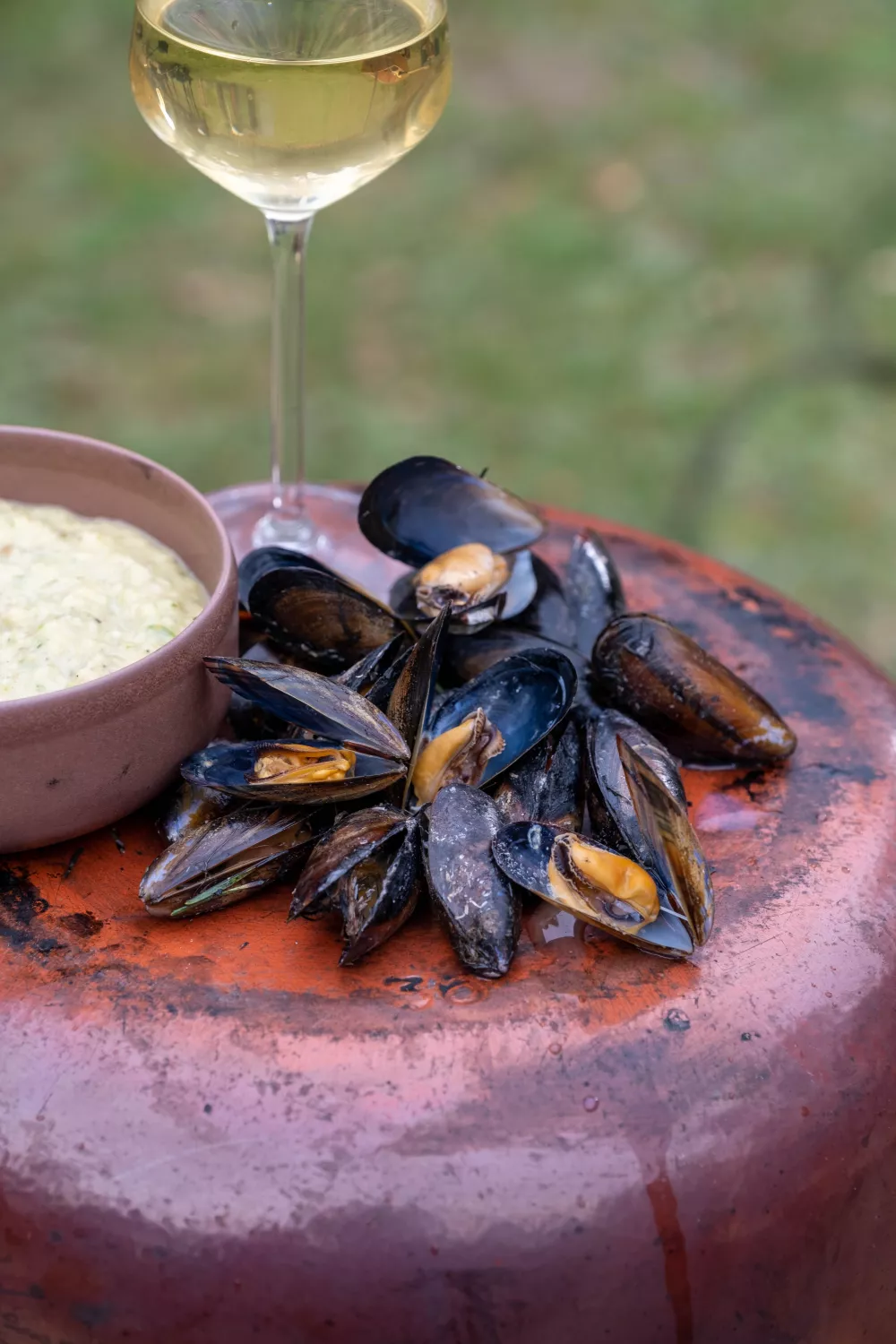 Bedek de mosselen met een flinke laag droge dennennaalden. Steek ze aan met een keukenbrander en laat branden tot ze vanzelf uitdoven. Blaas de assen van de mosselen en serveer ze samen met de rouille.