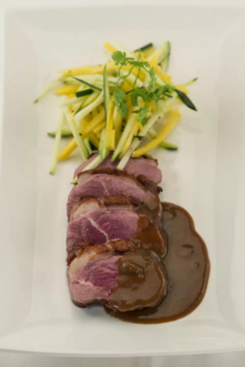 Serveer de gebakken eendenfilets met het mango-courgetteslaatje en serveer samen met de saus.