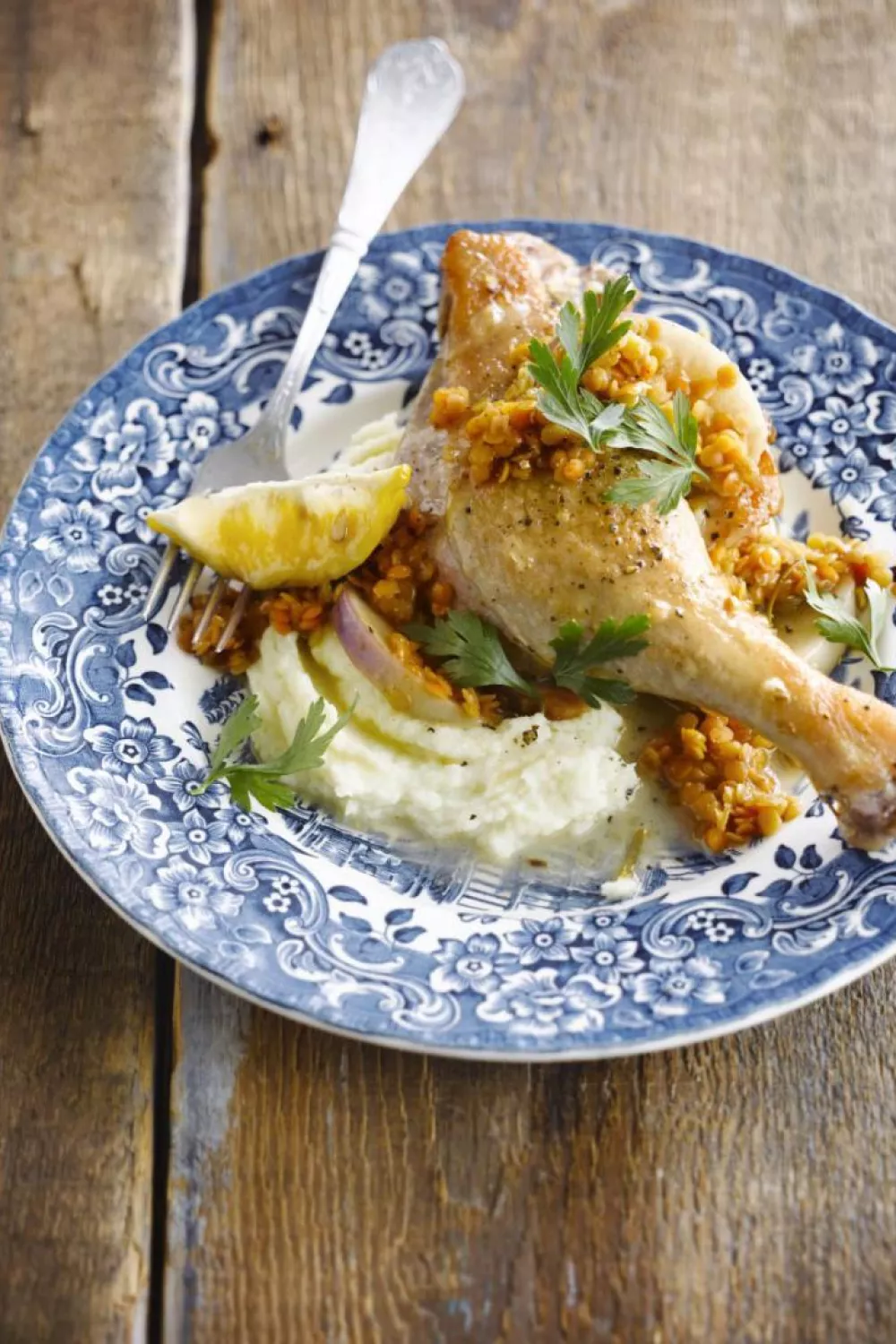 Serveer de eendenbouten met de linzenmengeling, bladpeterselie en aardappelpuree.