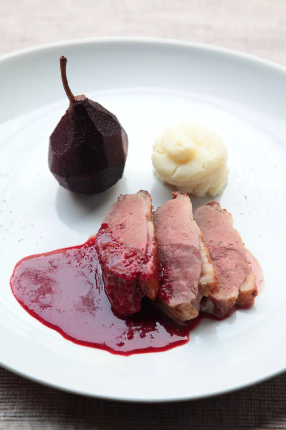 Feestelijk hoofdgerecht voor het wildseizoen: malse wilde eendenfilet met een fluweelzachte saus van rode biet, rode wijn en gereduceerde kalfsjus met een vleugje balsamico. De eend wordt eerst kort aangebakken en daarna in de oven gegaard, met knolselder aardappelpuree en in wijn gepocheerde stoofpeertjes erbij. Perfect voor een chic diner, feestdagen of een winterse zondag.