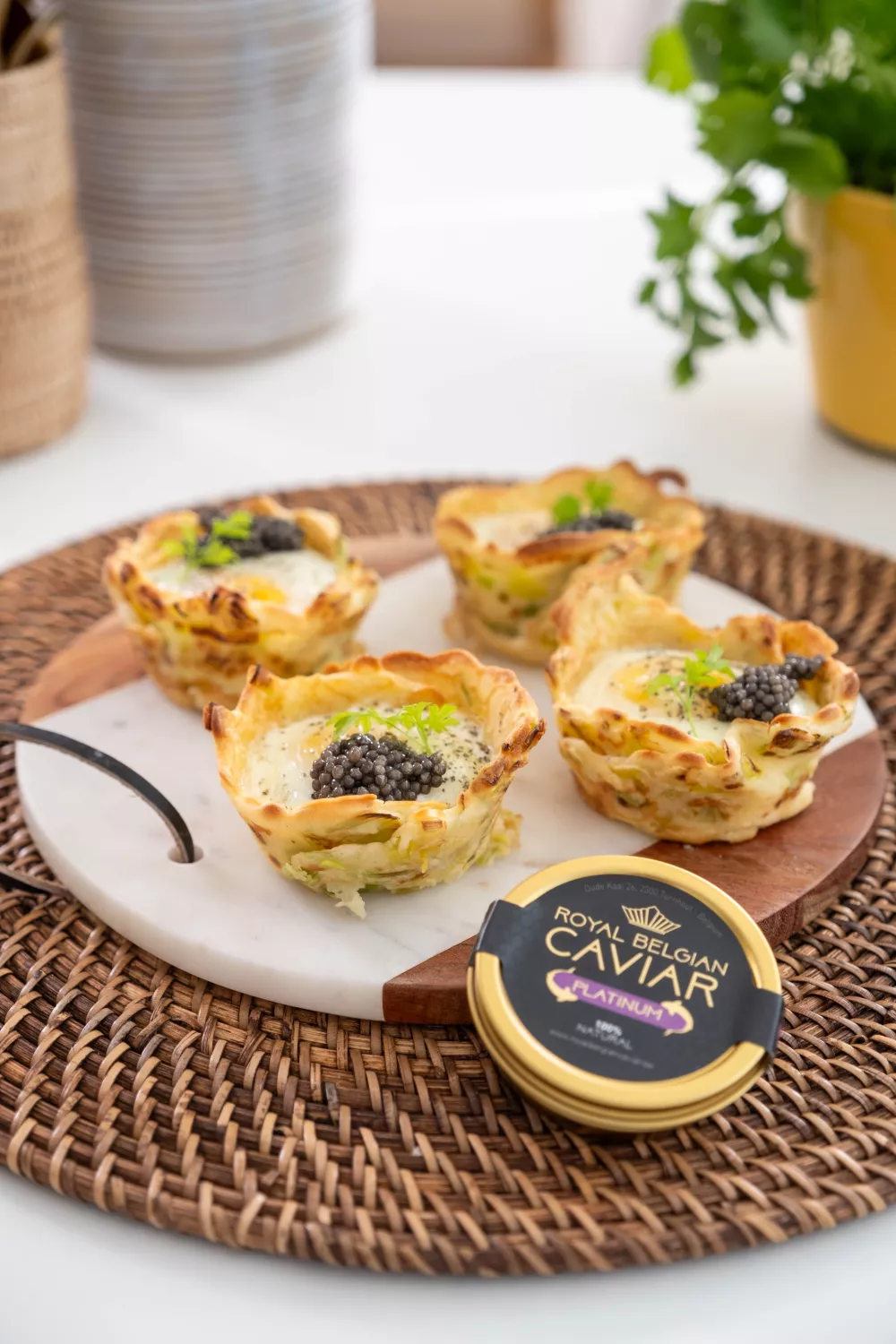 Malse hartige pannenkoekjes met gestoofde prei vormen zachte nestjes waarin een romig ei en een lepeltje kaviaar samen voor een verfijnde smaakexplosie zorgen. Het eenvoudige beslag van bloem melk en zure room wordt in de pan gebakken en in een muffinvorm gevormd tot nestjes waarna de eitjes in de oven garen. Perfect als feestelijk voorgerecht of luxe brunchgerecht in het voorjaar en makkelijk voor gasten te bereiden.