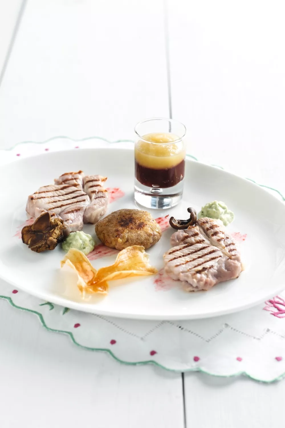 Een eigentijdse speenvarkenfilet met rijke herfstsmaken: sappig gegrild vlees, romige spruitjesespuma met geitenkaas en een frisse veenbessencoulis. Appelmoes op droge witte wijn, veenbessengelei en krokante zoete aardappelcrisps geven zoet en zuur tegenwicht terwijl notenhamburgers en bospaddenstoelen diepte en textuur brengen. Perfect voor een feestelijk diner tijdens herfst en winter, met moderne technieken zoals espumafles, agar agar geleren, kort frituren en grillen voor een verfijnde bordpresentatie.
