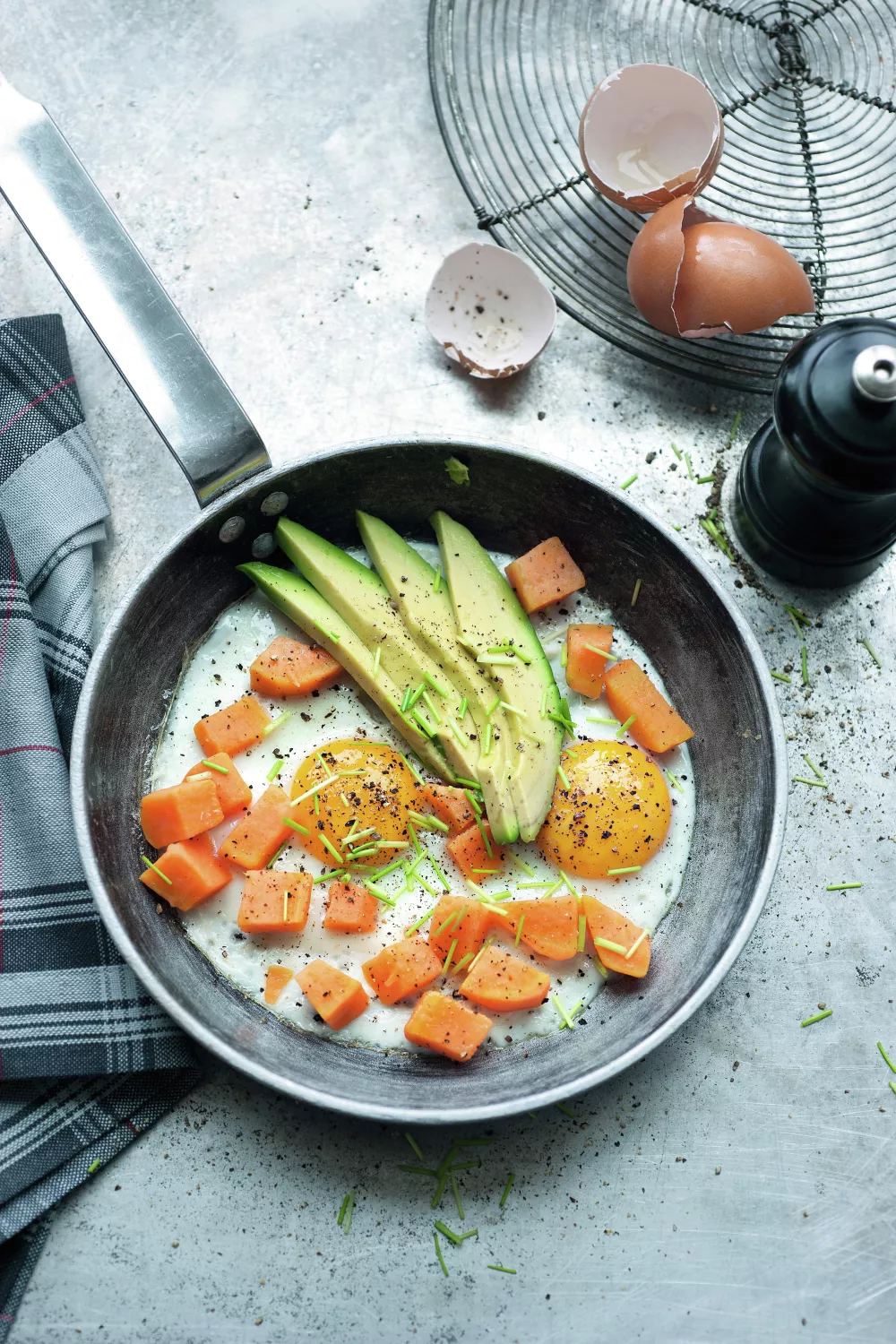 Schil de zoete aardappel, snijd hem in kleine blokjes en stoom ze tot ze beetgaar zijn. Snijd het uitje fijn en fruit het in een pan met wat kokosolie of olijfolie. Breek de eieren in de pan en bak ze op een middelhoog vuur ‘sunny side up’. Strooi er meteen de zoete aardappelstukjes over en laat ze mee garen. Verwijder de schil en de pit van de avocado en snijd in schijfjes. Knijp er wat limoensap over.
