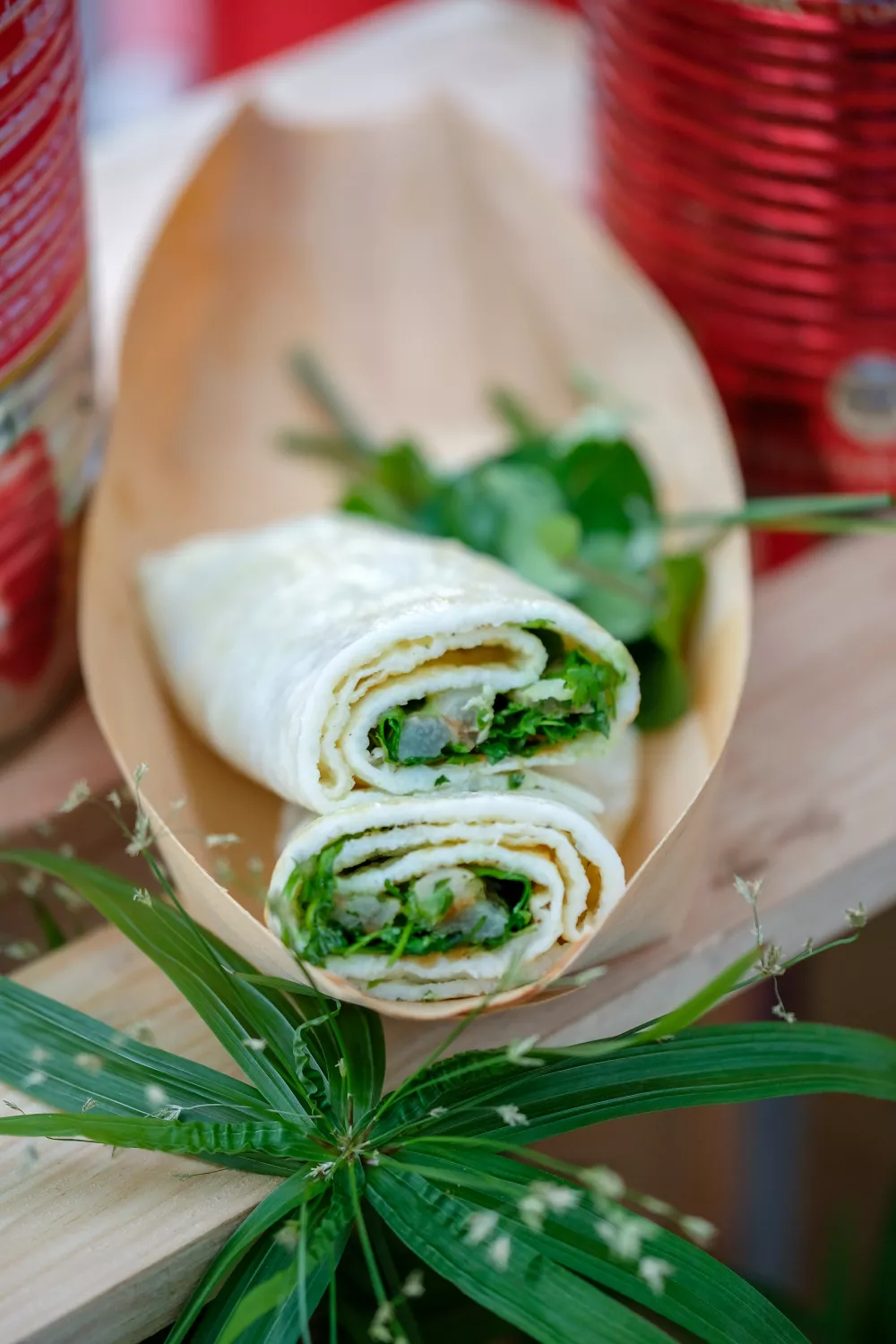 Leg een eiwitomelet op een bord. Leg er wat kervel, waterkers en enkele gebakken asperges bovenop. Besprenkel met de dressing en rol de omelet op. Snijd in stukjes alvorens te serveren.