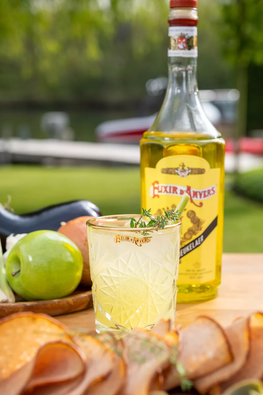 Sprankelende zomercocktail met Elixir d'Anvers, pittige gember, frisse groene appel en citroen, ideaal als licht aperitief bij een tuinfeest of zonnige avond. Geraspte gember en appel worden geperst en krachtig geshaked, vervolgens afgewerkt met bruiswater en gegarneerd met citroengras en tijm voor een kruidige, verfrissende afdronk.