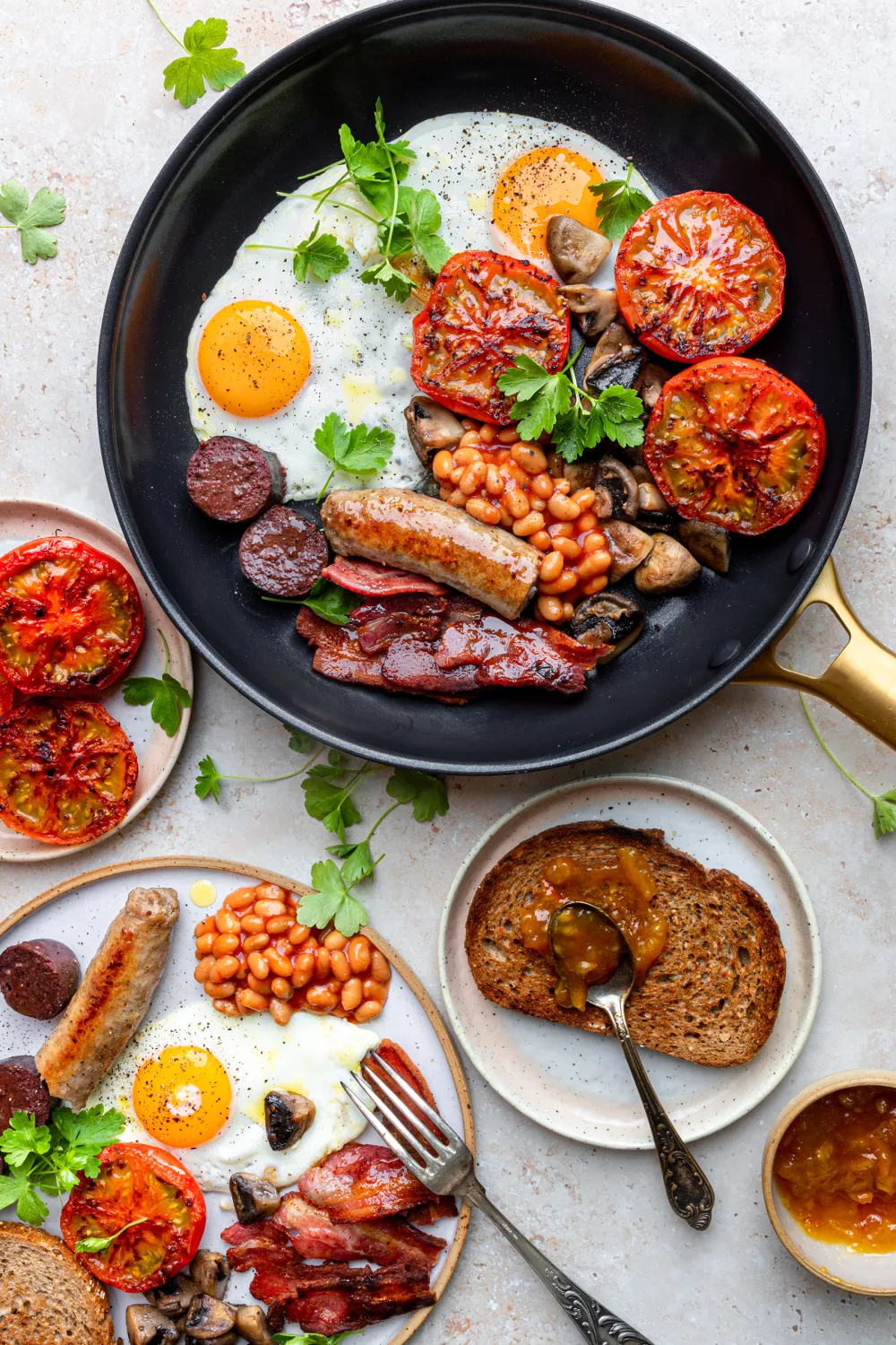 Een stevig Engels ontbijt vol hartige smaken en robuuste texturen met goudbruin spek, sappige braadworst en zwarte pens. Tomaten en champignons worden kort in de pan gebakken, spiegeleieren komen erbij en warme bonen met geroosterd brood vullen het bord aan. Perfect voor een winterse ochtend of luie weekendbrunch, eenvoudig te bereiden en lekker met een potje confituur.