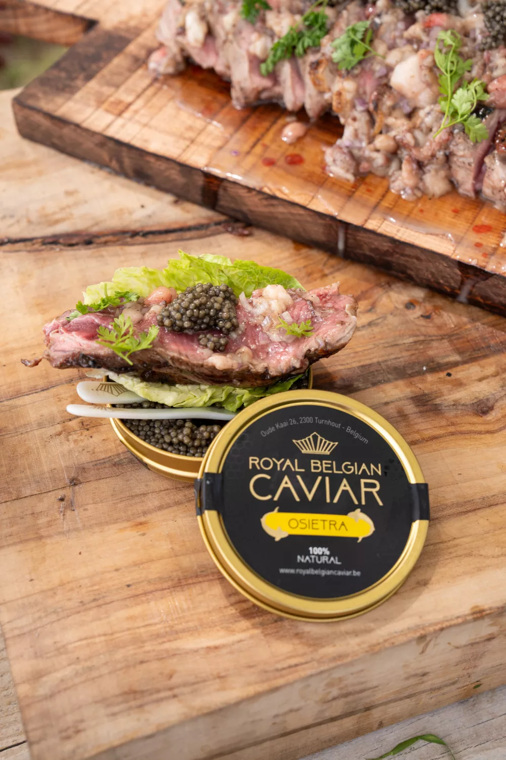 Een luxueuze entrecote omwikkeld met mergpijpjes en afgewerkt met kaviaar, perfect voor een feestelijk diner of zomerse barbecue. Het vlees krijgt een goudbruine korst op de grill terwijl het smeltende merg het vlees sappig en smaakrijk maakt. Serveer dun gesneden in slaharten voor een elegant contrast tussen rokerig gegrild vlees, romig merg en zoute kaviaar.