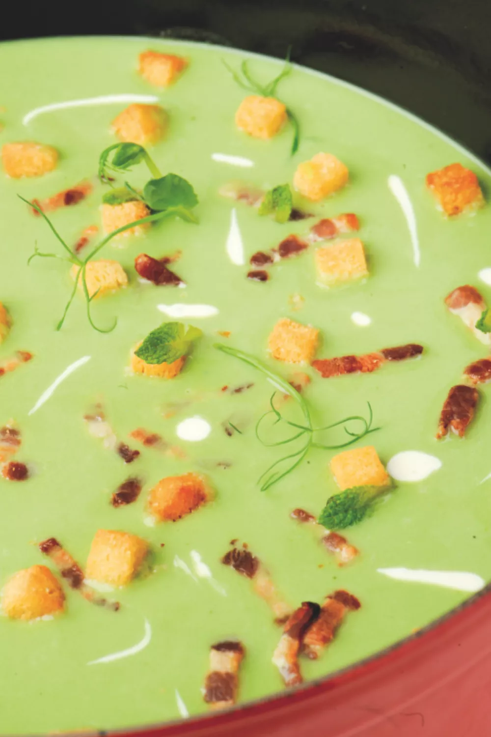 Deze fluweelzachte erwtensoep met een scheut room krijgt extra karakter van tijm, laurier en frisse munt. Na het sueren en blenden passeer je de soep voor een zijdezachte textuur, afgewerkt met krokante broodcroutons en knapperig gerookt spek. Een hartverwarmend comfortgerecht, ideaal als wintermaaltijd of verfijnde starter bij een lenteetentje.