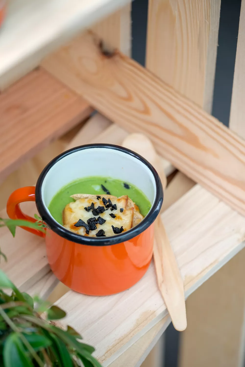 Een romige erwtensoep met gerookte heilbot en een knapperig kaastoastje van scamorza, ideaal als warm voorgerecht of hartige lunch in herfst en winter. De soep wordt in de soupmaker tot een zijdezachte textuur gebracht en krijgt extra diepte van tarama en een crumble van olijven. Serveer met goudbruine toastjes uit de oven voor een volle, rookachtige smaakbeleving.
