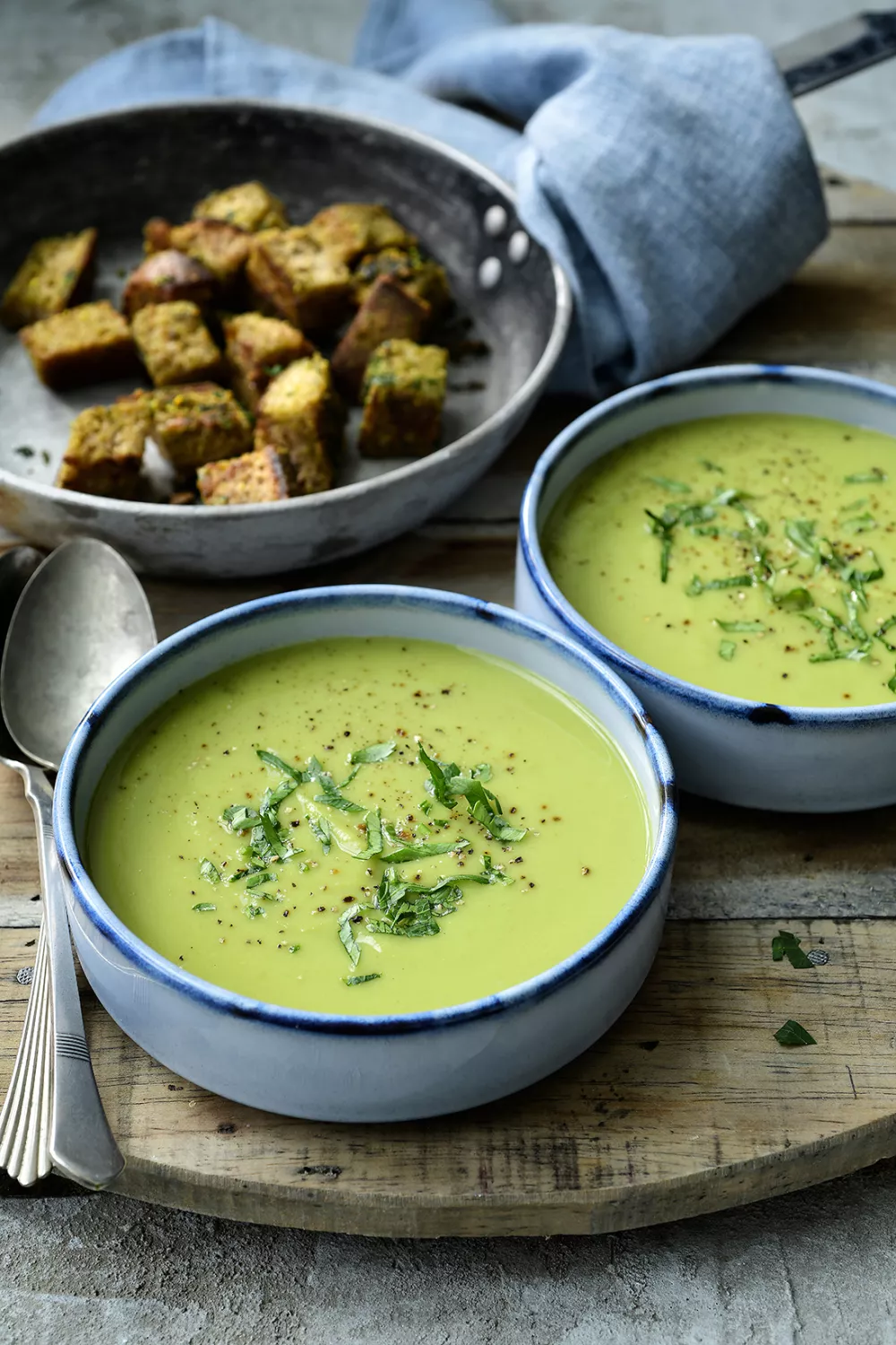 Mix de soep, breng op smaak met peper en zout. Serveer met de pestocroutons.
