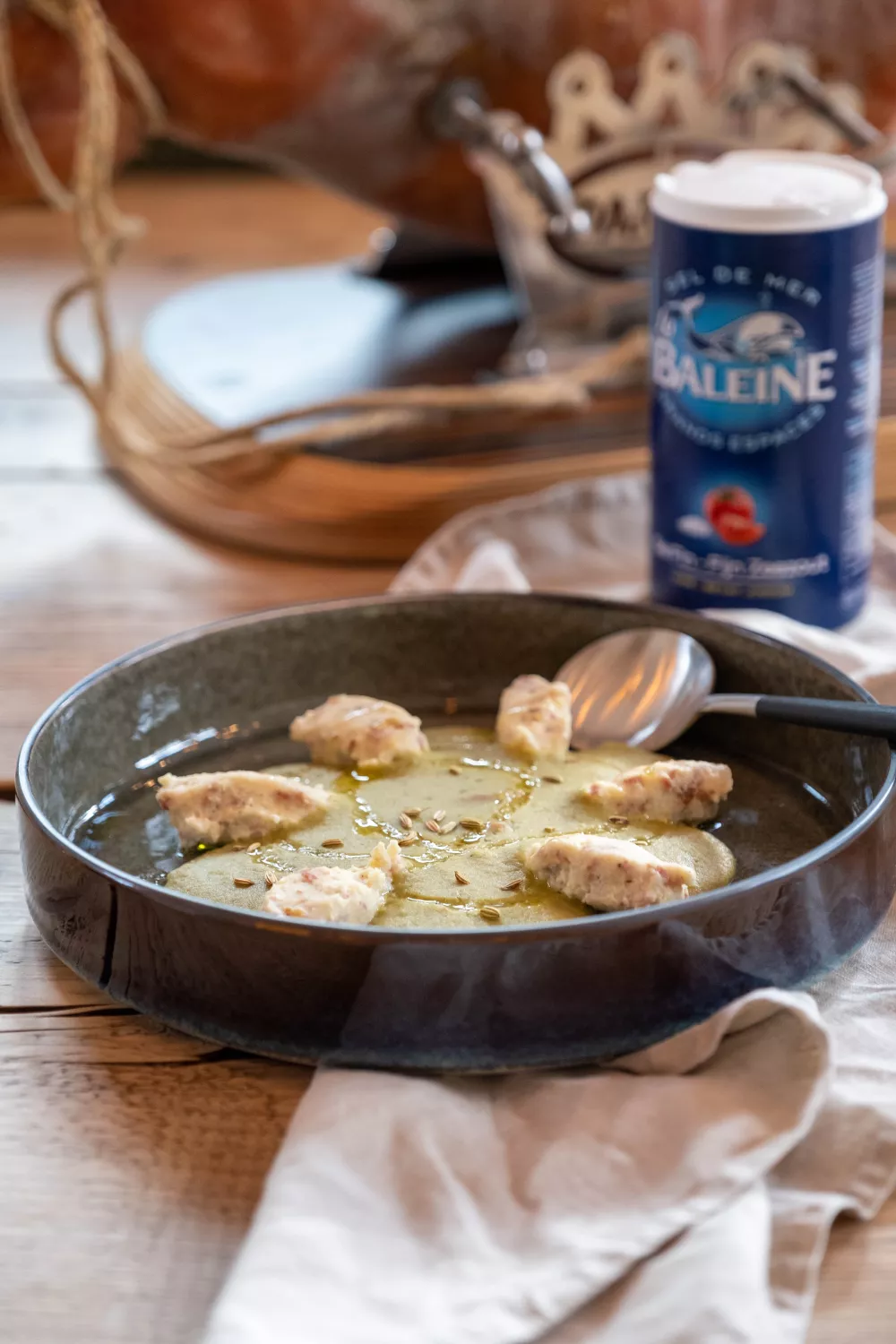 Romige erwtensoep met verse erwtjes, prei, selder en aardappel, verrijkt met huisgemaakte kipquenelles met blokjes Parmaham. De soep wordt zacht gestoofd en gepureerd, en de kipballetjes worden in bouillon gepocheerd voor extra sappigheid. Perfect als hartige lunch of winterse avondmaaltijd en een smaakvolle keuze voor seizoenskeuken en comfort food.