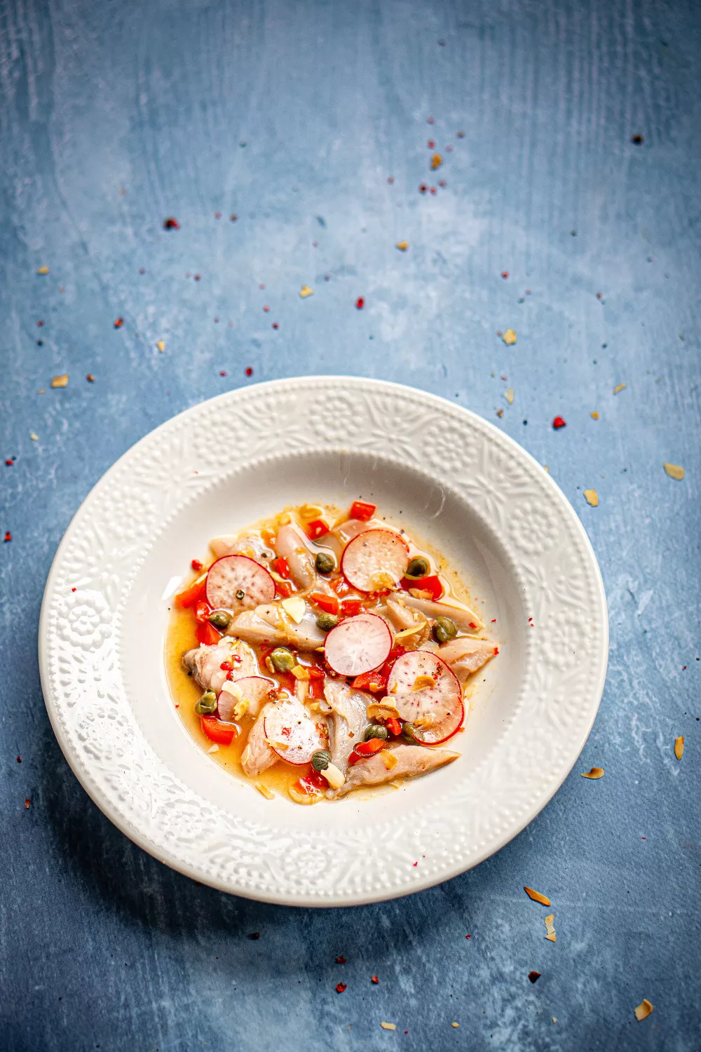 Deze frisse escabeche van makreel combineert kort gepekelde vis met een zoetzure sherry- en mandarijnmarinade en knapperige radijs. Gestoofde puntpaprika met sherryazijn en witte wijn geeft diepe smaak, afgemaakt met kappertjes en geroosterde amandelschilfers. Ideaal als licht voorgerecht bij een zomerse borrel of lenteplateau.