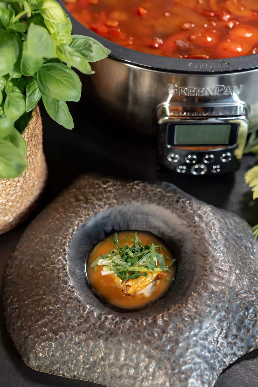 Stoof de uien aan in een scheutje olie in de GreenPan omnicooker*. Voeg vervolgens de look en stukken paprika toe. Roer af en toe goed om. Breng de groenten op smaak met paprikapoeder, tijm en rozemarijn. Zet het geheel onder met witte wijn, kippenbouillon en chardonnay azijn. Laat een uurtje pruttelen onder deksel. Zeef de escabèche en laat afkoelen.
