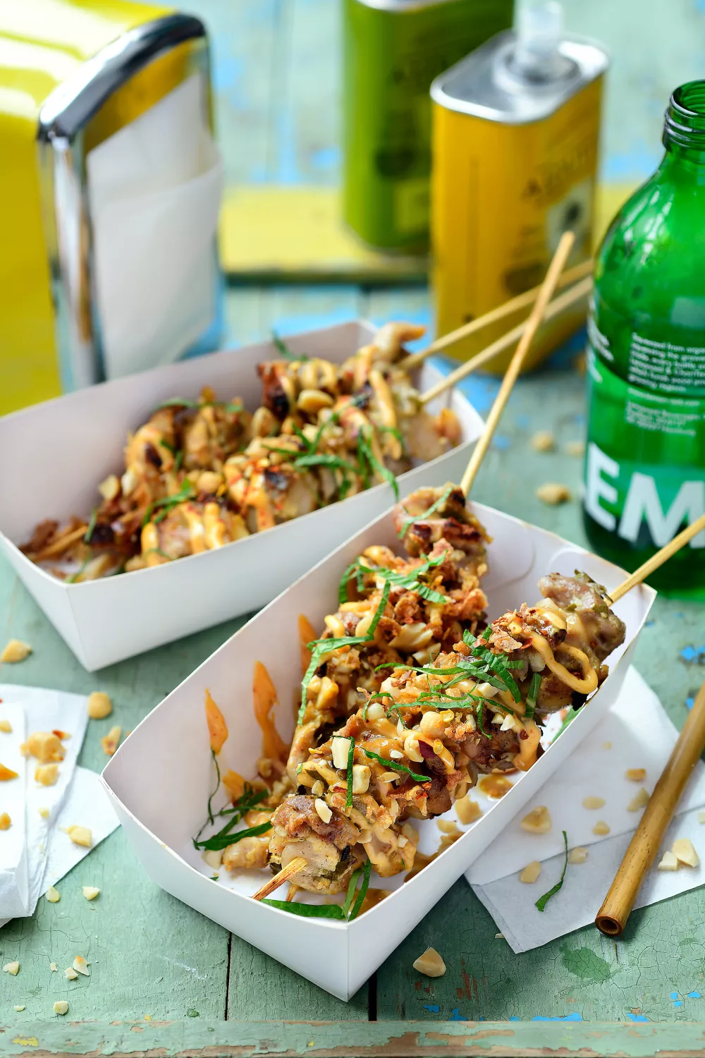 Leg de kippenspiesjes in een bakje en druppel er met een vork de pindasaus en shriracha mayonaise over. Werk af met chilivlokken, gefrituurde ui, pindanoten en verse munt.