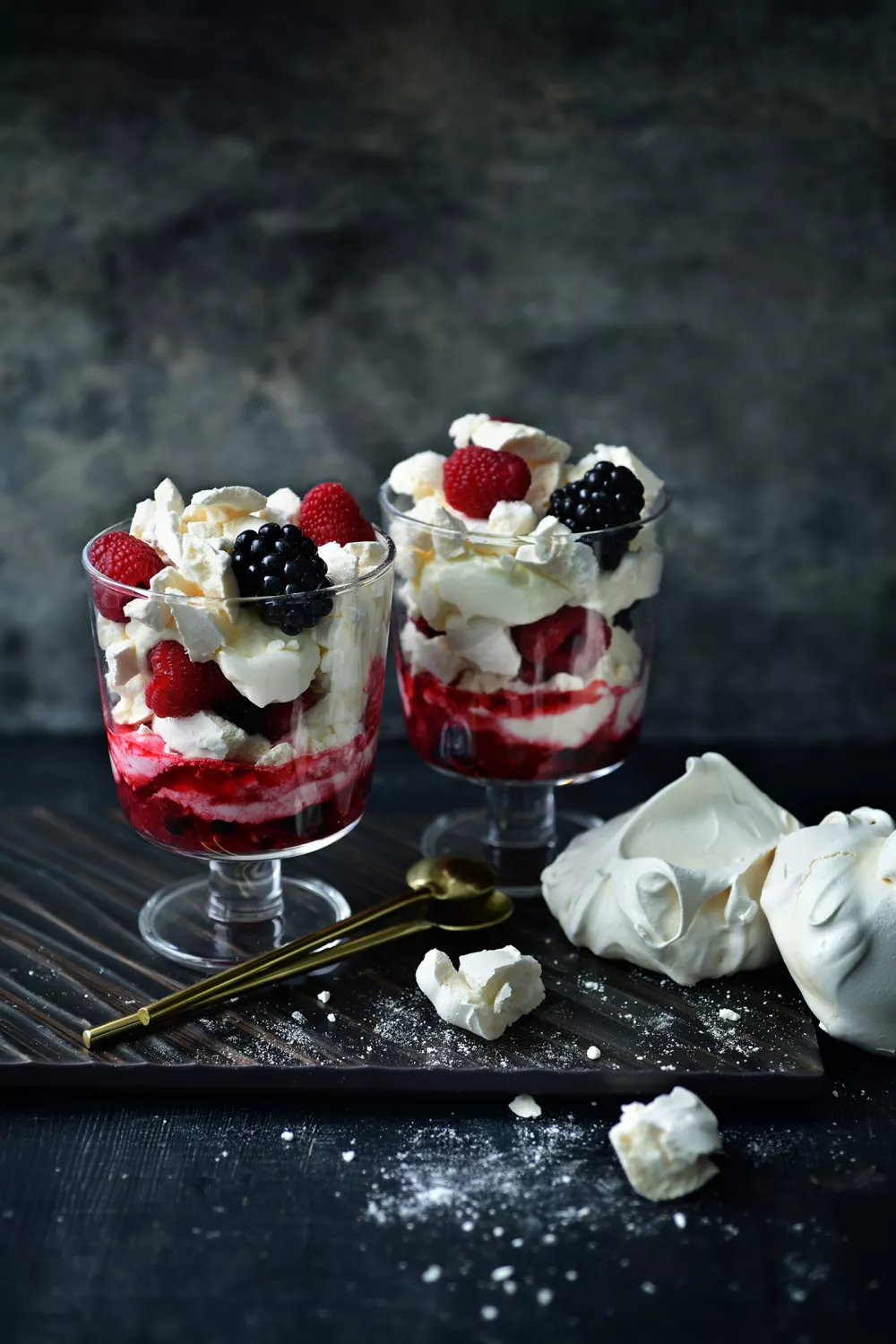 Tijd om te vullen! Neem een eetlepel van je geprakte vruchten, vervolgens een eetlepel slagroom en breek daarna rustiek je meringue boven het glas. Herhaal met geprakte en volledige vruchten, slagroom en meringue. De look mag nonchalant zijn en hoort niet perfect te zijn.