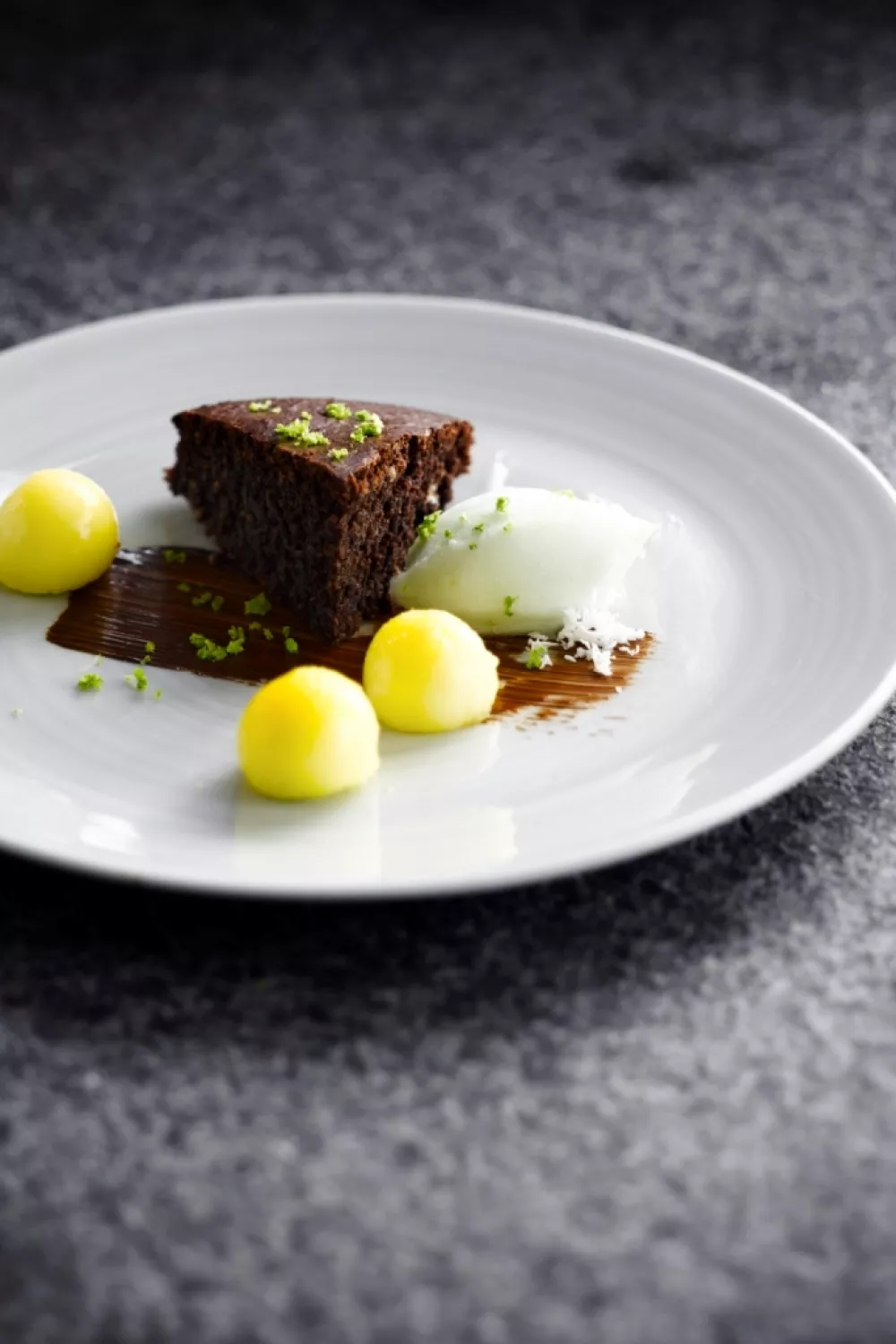 Snij de cake in gelijke stukken en dresseer op een bord met 3 bolletjes mango, een lepel limoensorbet en werk af met limoenzeste en kokosschilfers.