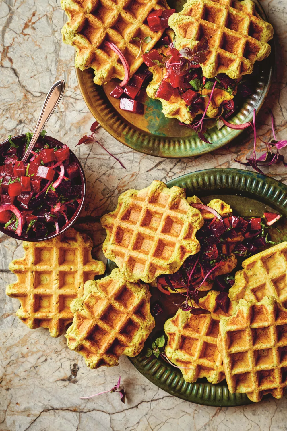 Deze krokante falafelwafels van kikkererwten met frisse rode bietensalade brengen Midden-Oosterse kruiden naar je brunch of zomerse borrel. Het mengsel van kikkererwten, verse peterselie en koriander, citroen en zelfrijzend bakmeel wordt kort gemalen in de keukenmachine en in het wafelijzer goudbruin gebakken voor een verrassende textuur. Serveer warm als lichte lunch of als kleurrijke feesthap met extra olijfolie en een scheut azijn.