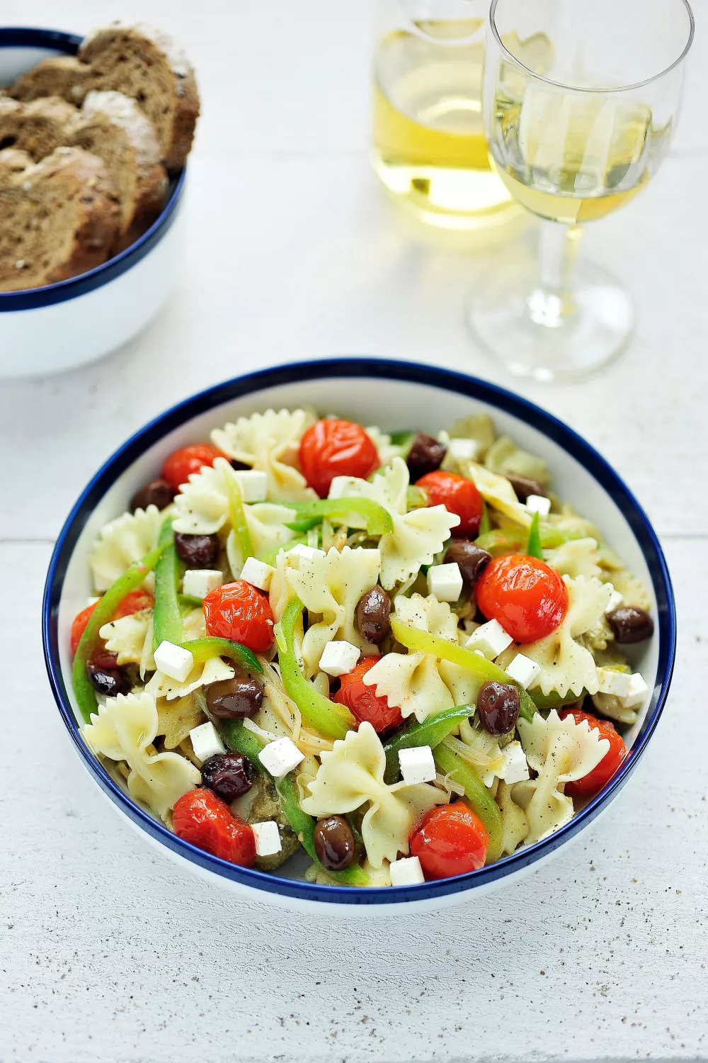 Doe de warme saus in een kookpot en voeg de nog warme pasta toe. Doe er daarna de sjalotjes, paprika’s en tomaatjes bij en stoof kort aan. Voeg er op het laatst de olijven en feta aan toe. Kruid met peper en grof zout. Dien onmiddellijk op.